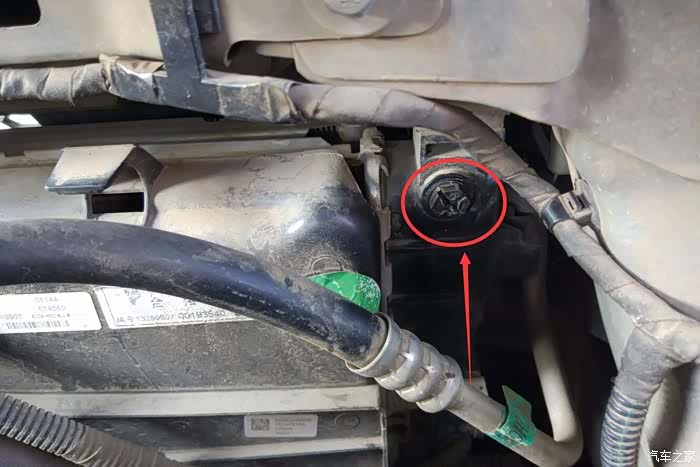 5、加入新的冷却液后,有的科友说捏一捏冷却液的橡胶软管,就会看到冷却液壶内冒泡,冷却液往下流,这也是一种办法,其实更有效的办法是,拧松冷却液的排气螺丝,排气螺丝在什么位置很多科友一直说得很不清楚,下面我就把冷却液的排气螺丝位置告诉大家。