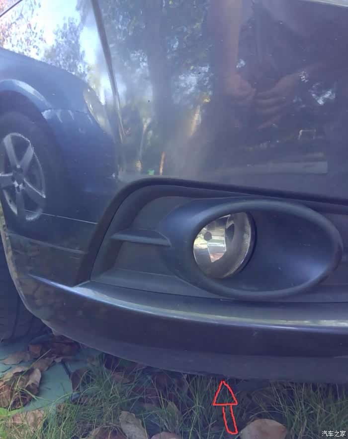 2、拧掉冷却液下部放液堵头,这个是塑料的,位置在右前雾灯处,下图箭头位置,直接用手伸进去就可拧下来,注意的是:防止冷却液烫伤。