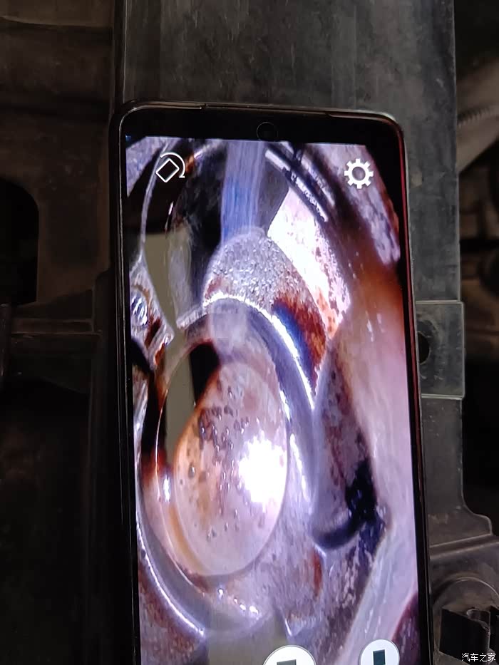 在修理厂做了内窥镜检查,可见活塞顶上积碳非常厚,并超过了活塞边缘,随时有剥落的风险,超过活塞边缘的积碳,在发动机运转过程中,随着活塞高速的往复运动,会刮伤缸壁,留下一道道浅浅的“印迹”,这表示已经有了拉缸的趋势了。