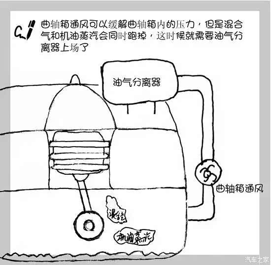 因为在混合器燃烧时会产生废气,少量废气又会从活塞环的间隙渗透到曲轴箱中。曲轴箱中的压力就会增大,这时候需要一个平衡装置来平衡曲轴箱中的压力。这就是曲轴箱通风系统。