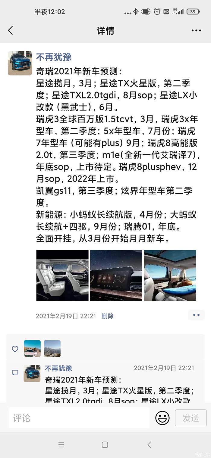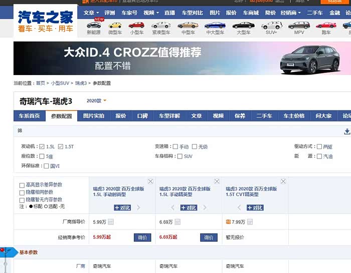 与此同时,看到了官网有 百万全球版(国Ⅵ)1.5T-CVT精英型 的配置,说明虎3的1.5T 的动力终于来了,马上就在之家上看了一下瑞虎3的配置,果然,1.5T 的在预售。