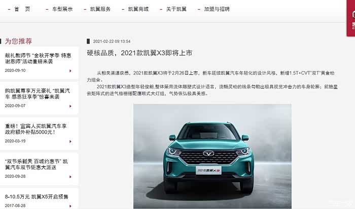 同时,我在凯翼官网上看到了 凯翼 2021款X3 预售的信息,***://www.kaiyihome.com/gw/gyky/qydt/xw/20210222/detail-2219.shtml,2021款X3将于2月26日上市,新增1.5T+CVT 双“T”黄金动力组合。