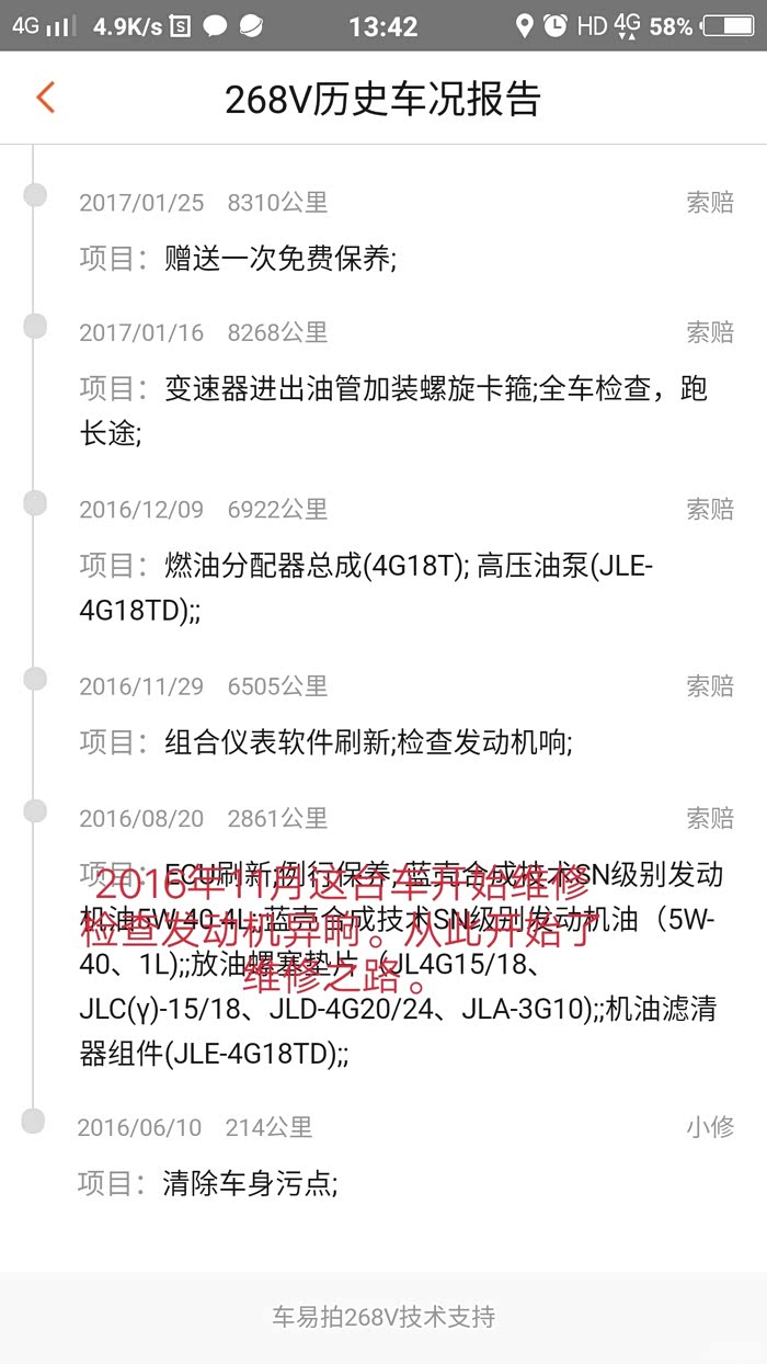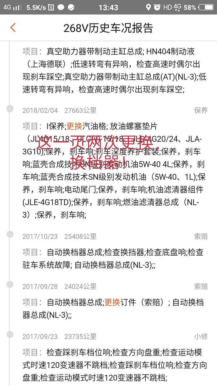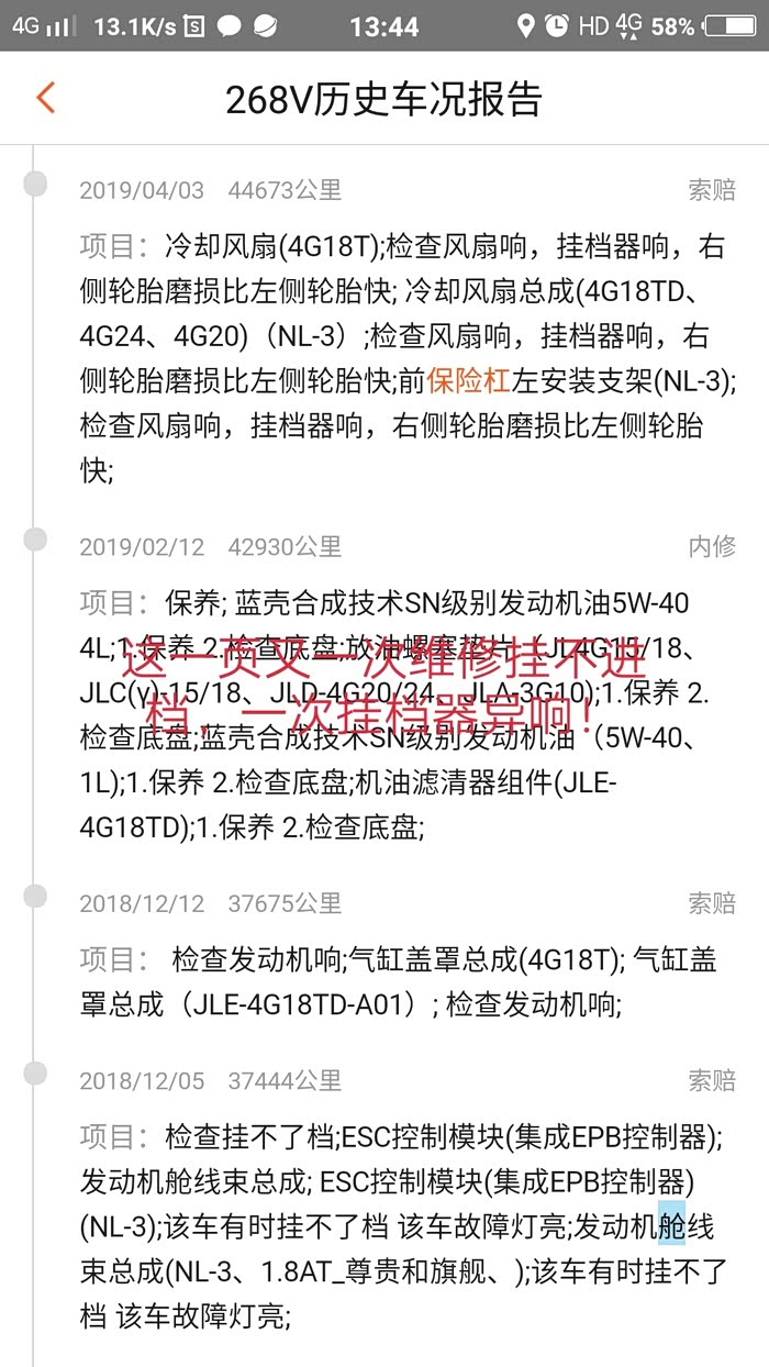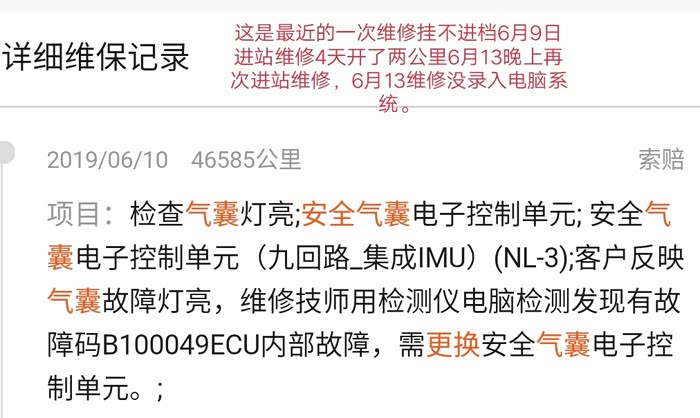各位车友看到这里,我不知道你们有什么想法?这辆车现已给本人造成了严重的工作和生活影响,隔三差五修车,有时候一个月要修两三次!严重影响到我及家人的生命安全——高速上刹车失灵差点出交通事故,至今回想起都非常害怕,挂不进档己经维修4次了!因挂不了档在市区差点出事故造成人员受伤!原本今年一起回家过年的亲人和朋友现在都不敢坐我的车怕随时出危险,怕被扔在路上!