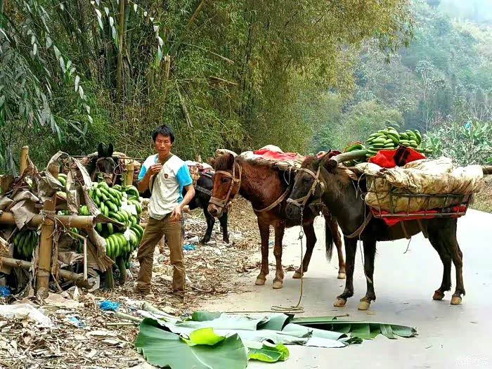 收获的香蕉用马驮到公路上来(原上草拍摄)