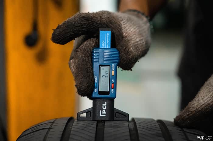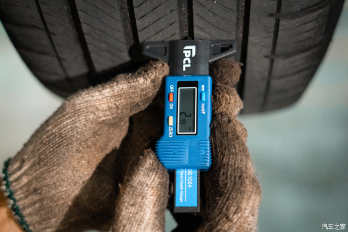 再看轮胎,这也是那个同款车主最不可思议的地方。经过4S店师傅检测,我的车四条轮胎坑纹深度在2.9-3.47mm之间。新车轮胎坑纹大概在7-7.5mm,自然磨损约4-4.5mm,坑纹深度1.6mm以下需要更换轮胎,也就是说这套胎至少还可以再磨1.5-2mm。