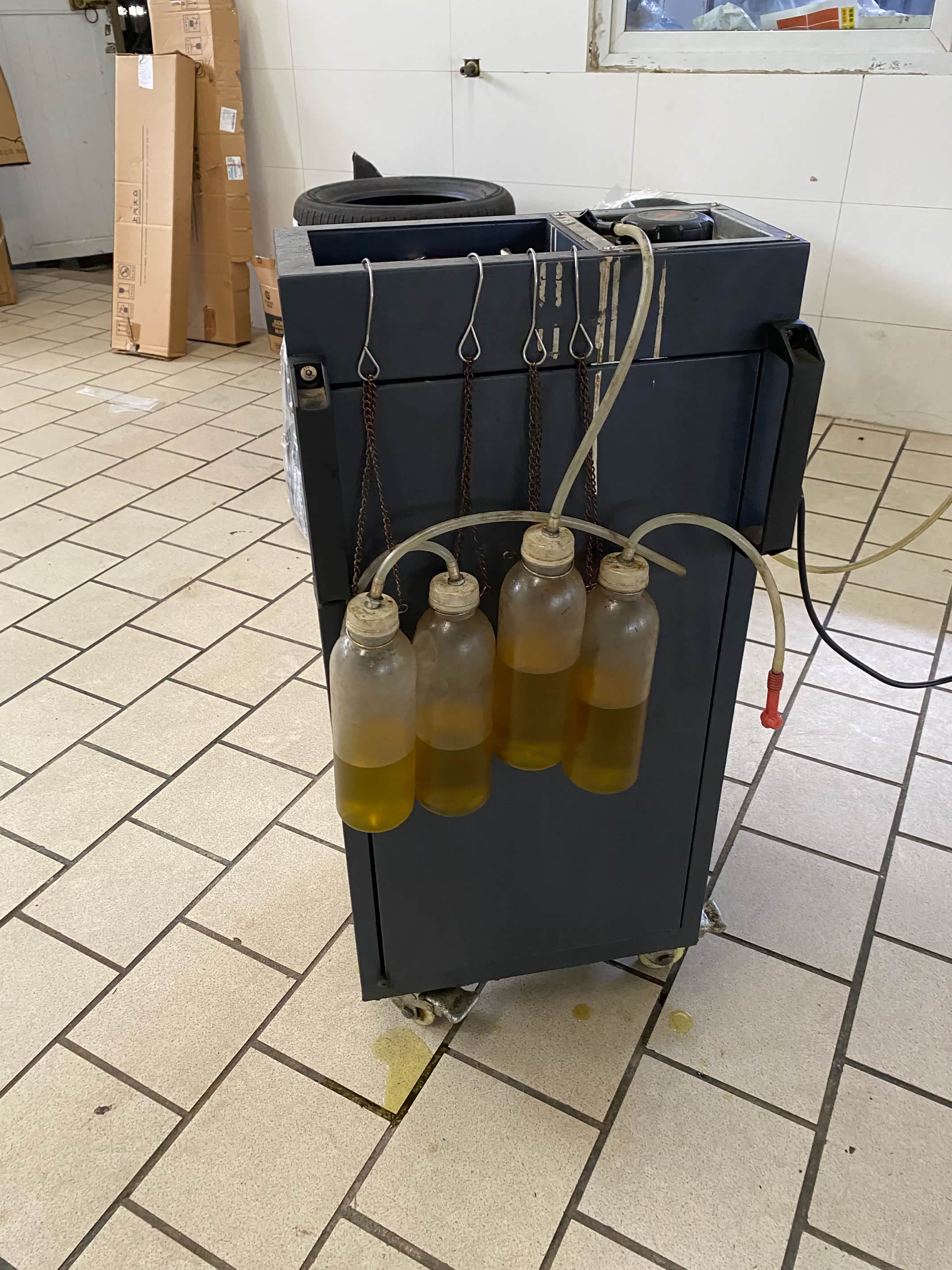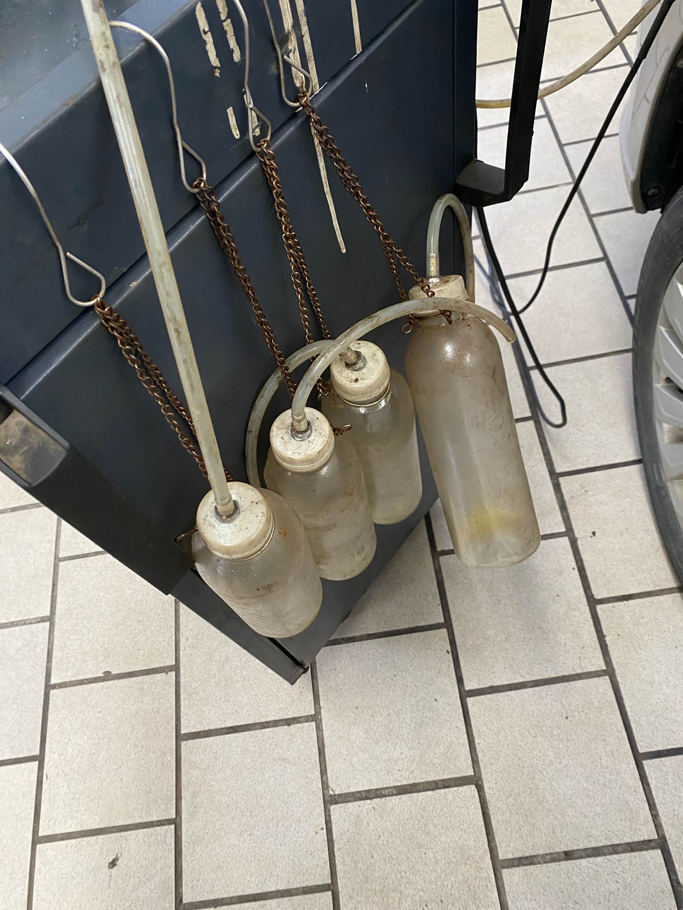 这里有四个油壶,是专门用来接旧的制动液的。