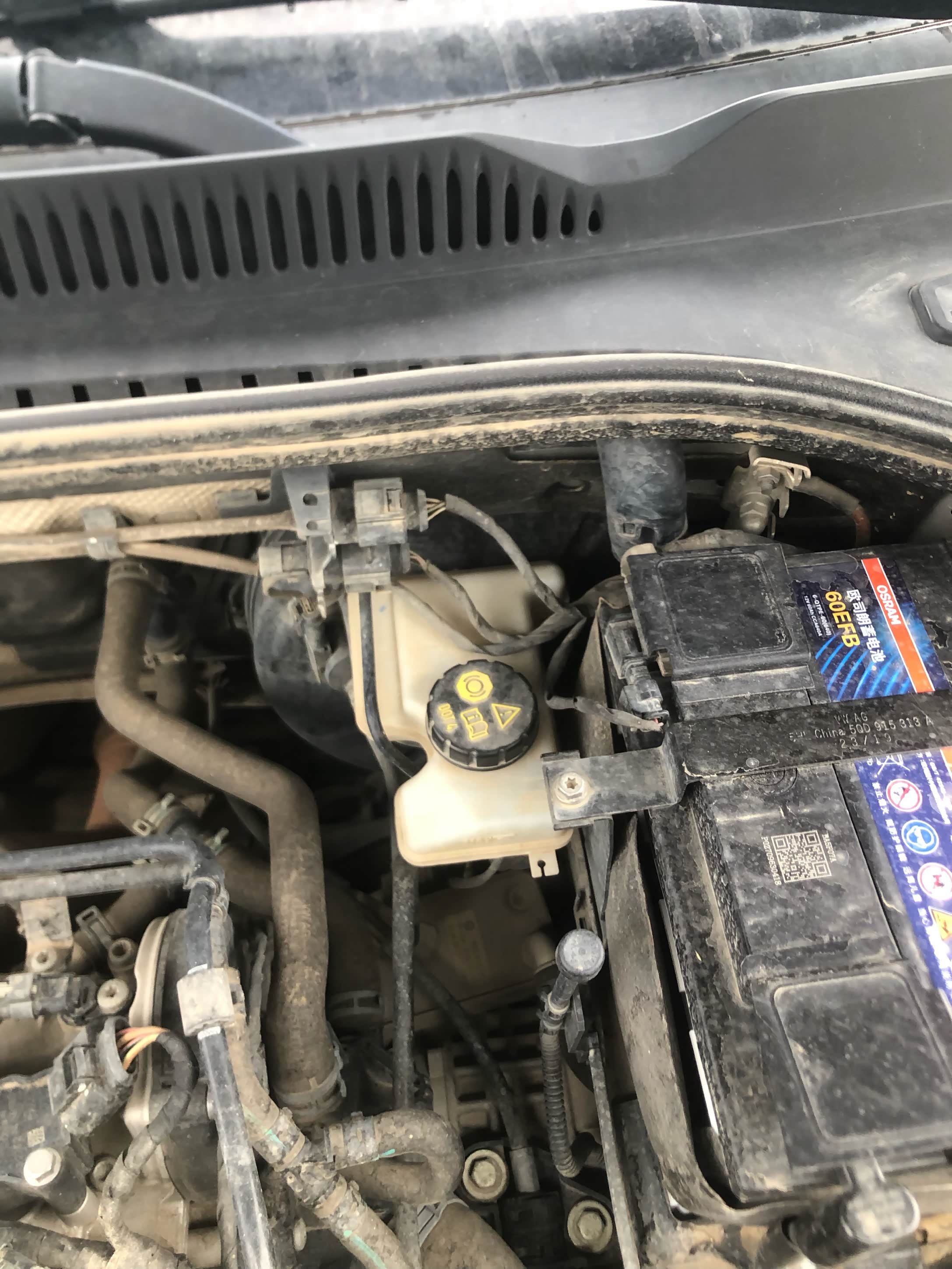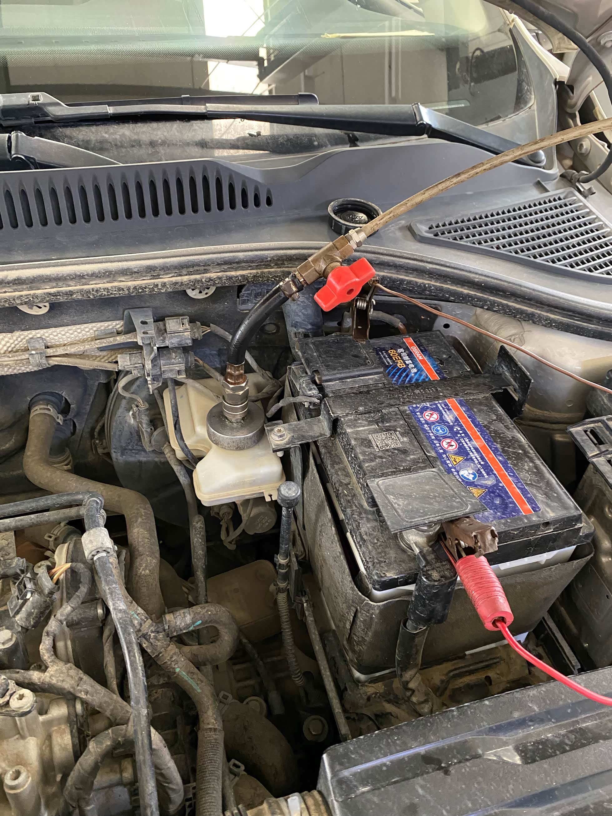 去掉制动液油壶的盖子,然后连接上压力机,正常的话要接入一个电瓶才能使用。上次更换的话就是他们店里面有一个电瓶。连接压力机,给压力机供电,这次的话就直接连上我车辆的电瓶了。这个操作有点儿不规范吧我感觉。