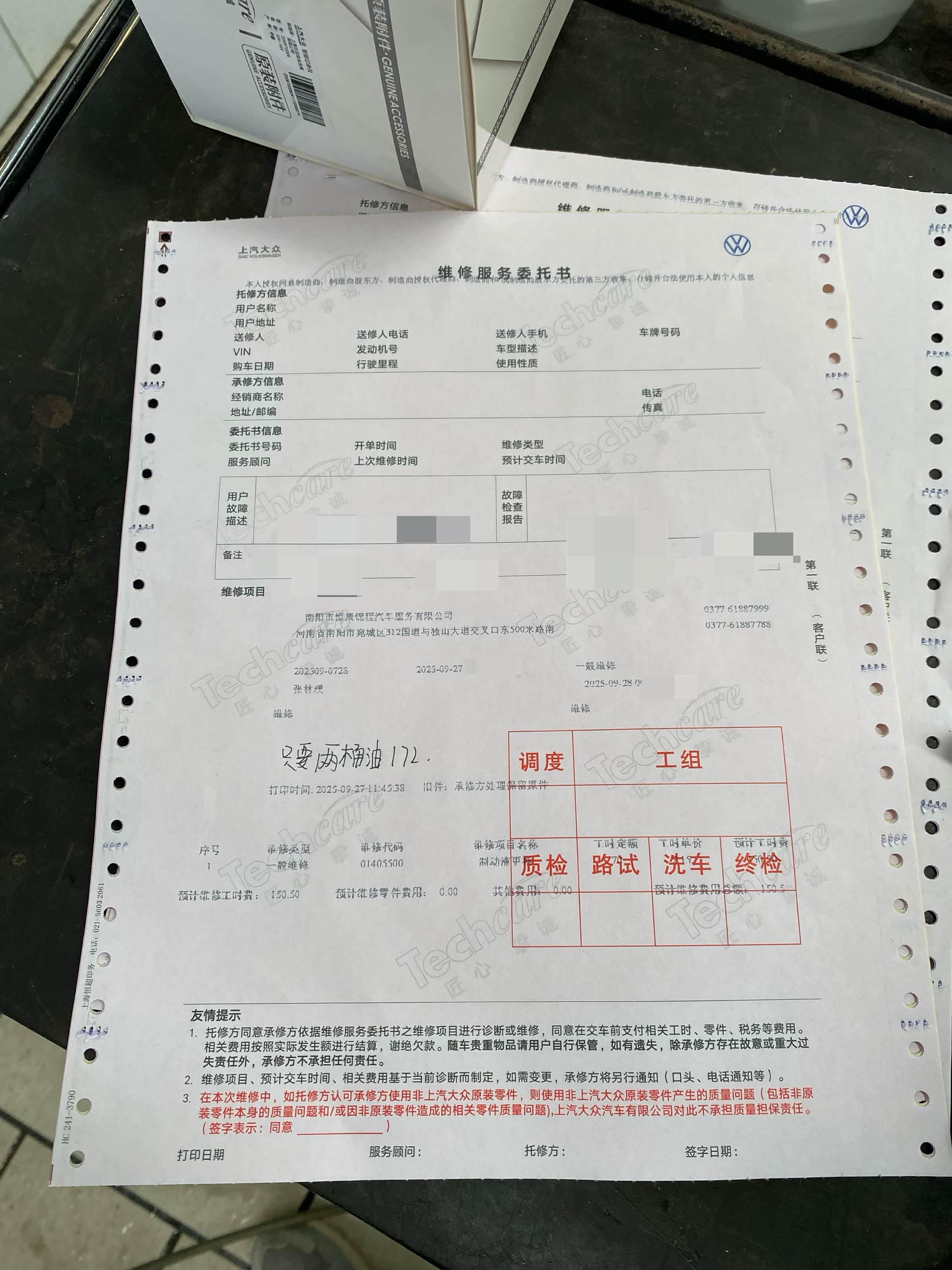最后再来看一下费用,刹车油两桶的费用是172,加上工时费150块5毛钱,一共是322块5毛钱。