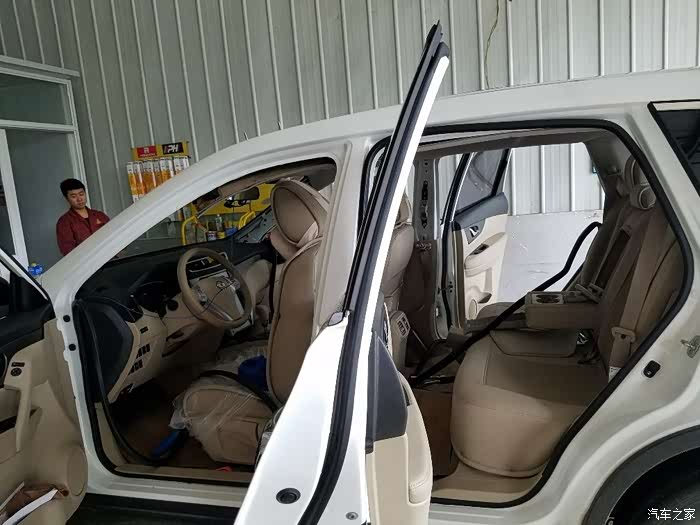 小工拉开主驾门上的胶条,再拉开A柱的板子,这样顶棚就可以看到了。漏水的位置就集中在边角上。