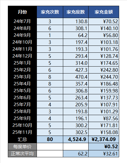 我家这个桩是去年7月装的,用到今天已经充了4525度电。国网APP上显示总电费是2374.09元。因为充电线离电表有55米远,线缆有损耗,实际电损大概在11%左右。这样算下来,平均每度电大概0.525元,比外面快充便宜了差不多七毛多(按均价1块3来算)。