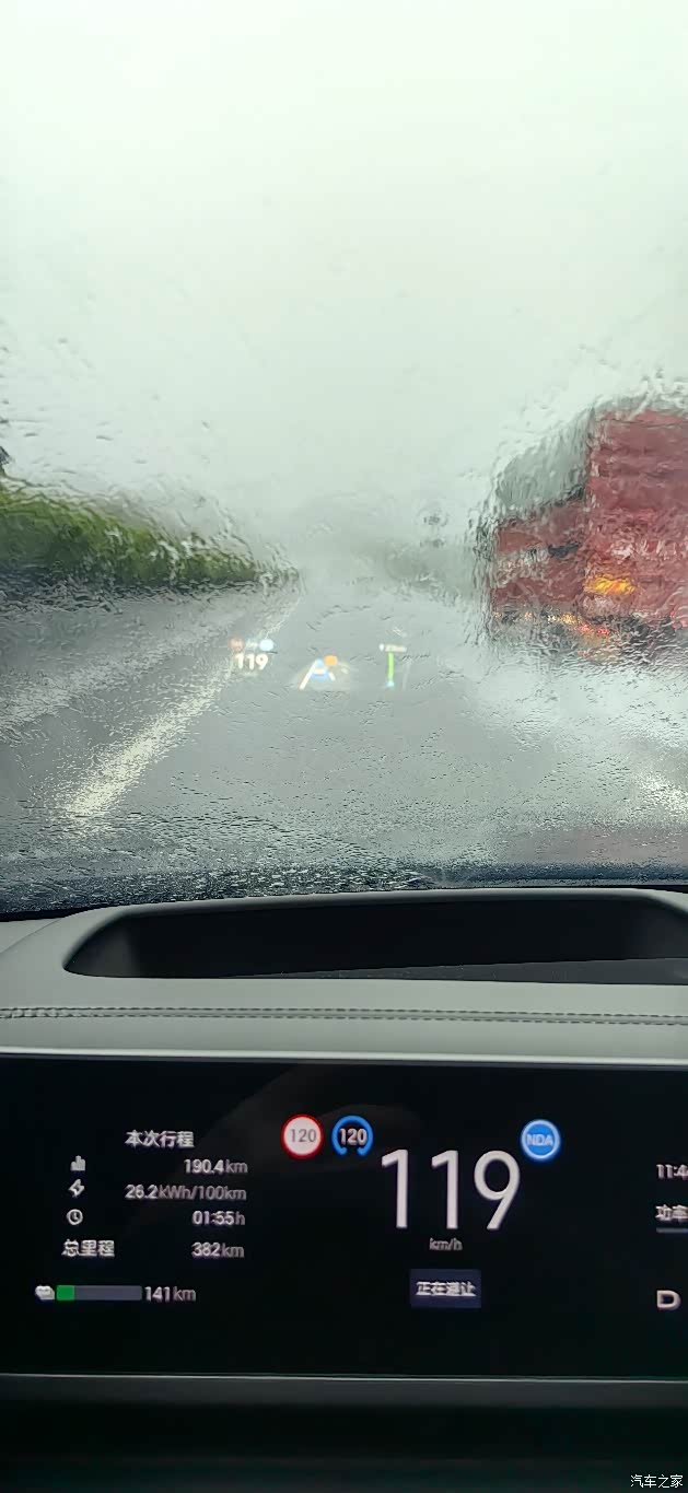 先说智驾。和之前开小鹏p7回家相比,HL的智驾能力有碾压性的提高。今天自从过了广州之后,一路上大部分时间都是大雨瓢泼,有时候完全前面就是什么都看不见,但昊铂HL依然稳稳的开,智驾也没有退出,全程几乎零接管,除了中间有一次,因为有一处积水过深,车胎压过去的时候溅出巨大浪花,我一紧张,自己手工拉了一下方向盘,并踩了刹车。另外就是进服务区后,完全要人工接管,这个有点遗憾。