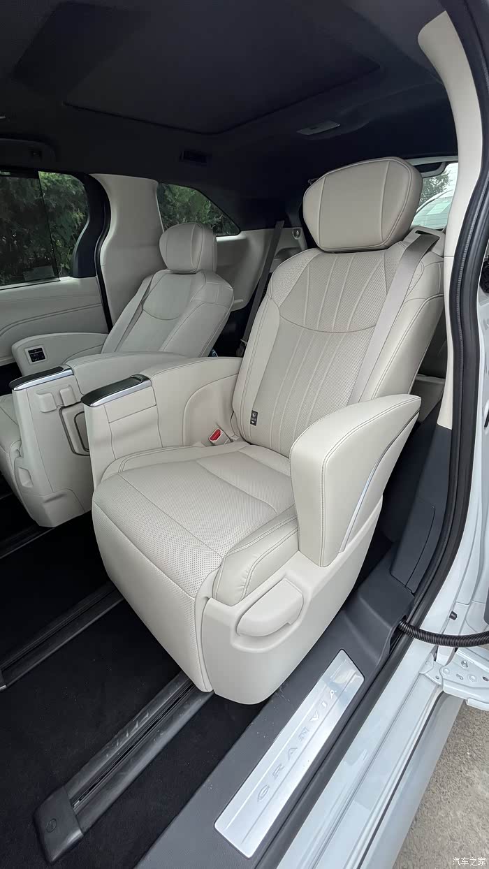 空间方面,格瑞维亚的表现堪称卓越。它采用 2+2+3 的七座布局,轴距达 3060mm。无论是前排还是后排,空间都十分宽敞,第二排独立座椅堪称头等舱级别,乘坐者可以轻松翘起二郎腿。即便是第三排,坐满人也不会觉得过于拥挤,头部和腿部都还有一定余量。扶手台下方暗藏超大储物空间,扶手箱更是深不可测,能容纳大量物品,空间利用率极高。电动侧滑门的设计非常贴心,方便乘客上下车,尤其是对于抱着孩子或携带重物的人来说,更是大大提升了便利性。展厅两个颜色内饰都给大家看一下。做工是真行不错,下有细节图展示!