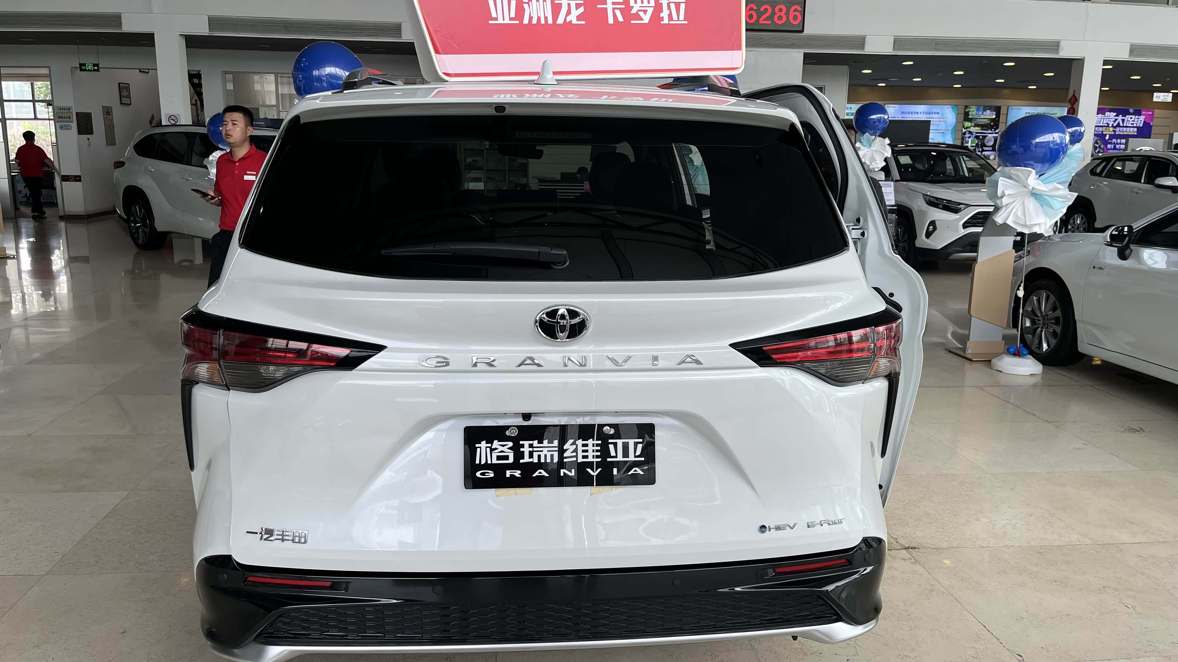大门口,醒目的红色活动拱门,十分显眼。展厅内活动物料布置营造出一种温馨且充满活力的氛围。销售热情地迎接了我,并带我来到了格瑞维亚面前,一场关于这款车的探索之旅就此开启。