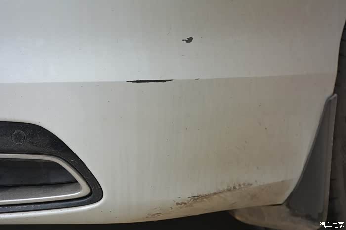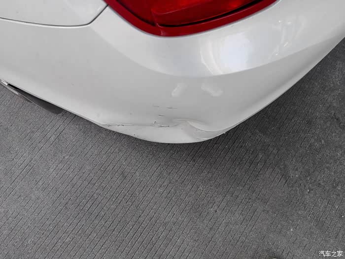 这是某次载人去修车行取车,进到车行后想要掉头停车,观察不仔细没有留意到后方有一辆翻斗车的推手朝着车子,结果后保险杠车牌位左边一点点的地方顶到了推车的推手,给顶出了一点点凹。