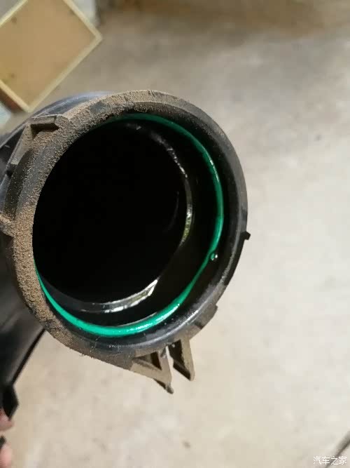 这个塑料管是从涡轮接出来的,也就是涡轮把空气加压后直接吹入这根管子,这些机油就是从涡轮轴承那渗出来的