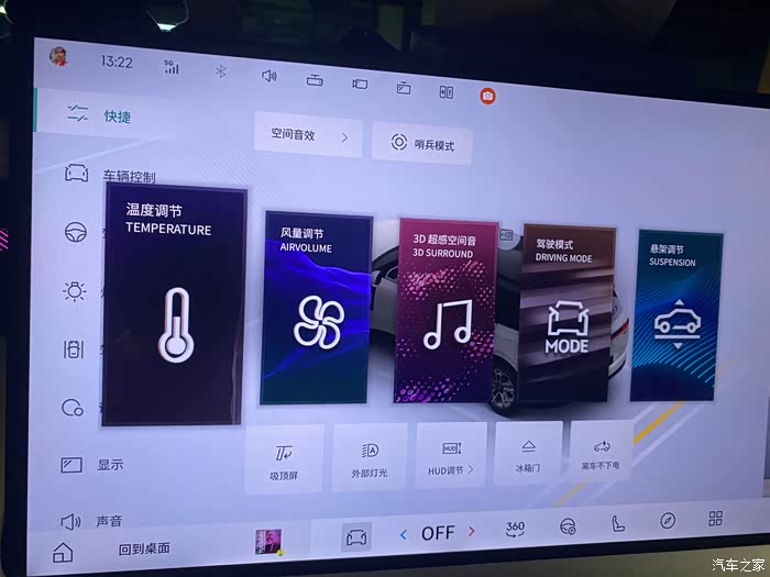 这个时候通过旋钮,可以进行温度调节、风量调节、音效调节、驾驶模式调节和悬架调节。相当于多一个快捷键。