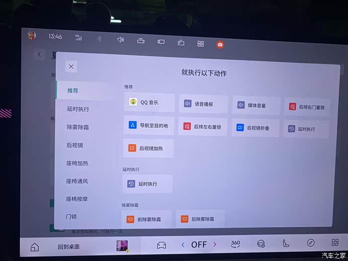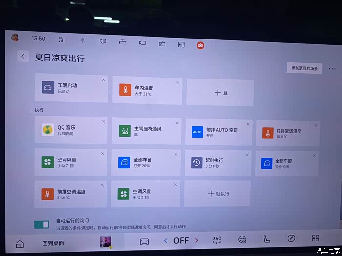 我设置的场景,车辆启动车内温度高于31摄氏度,QQ音乐会打开,主驾座椅通风打开,前排空调18摄氏度风量7挡车窗打开20%,3分钟以后车窗关闭前排空调24摄氏度风量2挡。