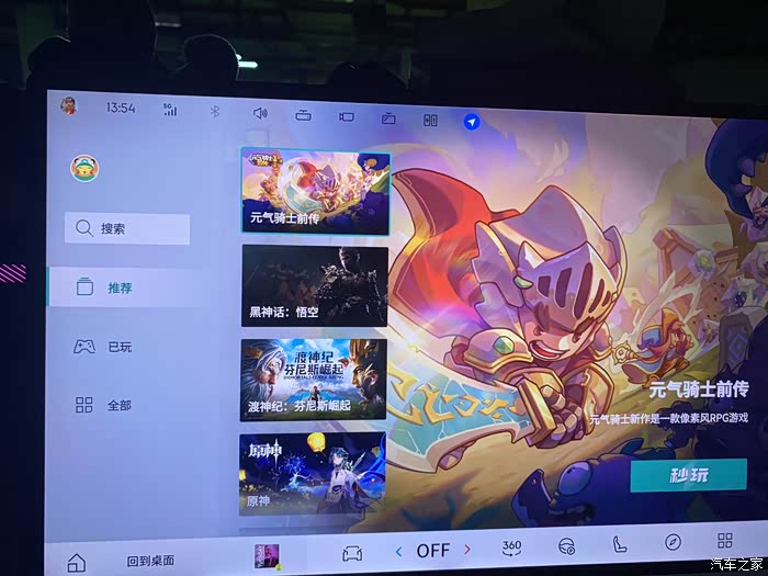 车机里的咪咕快游应用,打开有很多热门游戏,比如元神和黑神话悟空。