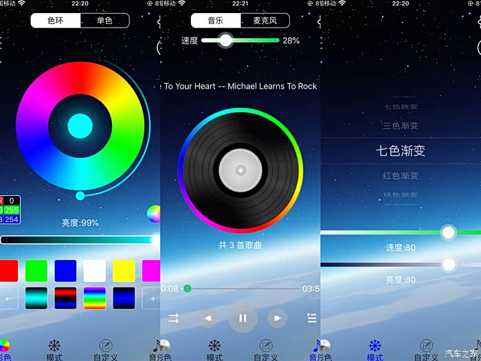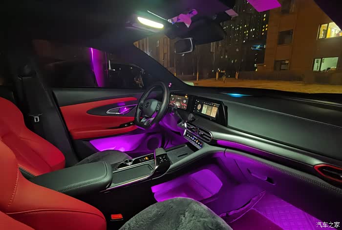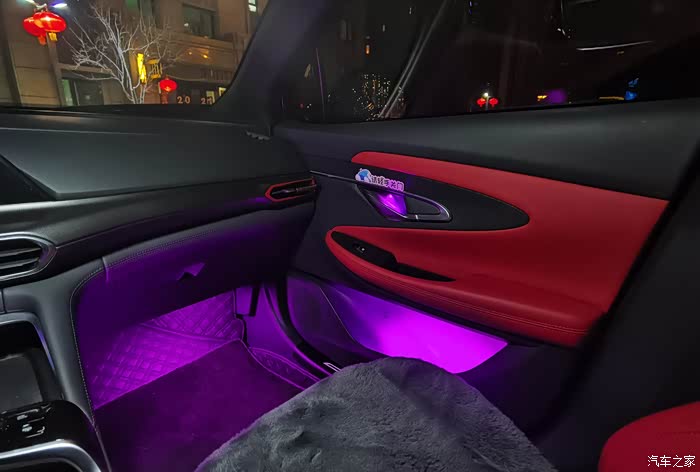 灯光是通过蓝牙链接手机APP来控制的,APP内的功能简直不能多的不能再多了。首先颜色是256色,可以根据APP内的色环选择自己喜欢的颜色,APP内也给了几十个固定的氛围模式供用户来选择。另外APP内也可以自定义模式,选择自己喜欢的多种颜色进行搭配,调节自己喜欢的切换模式、切换速度和灯光亮度。最有特色的是它的音乐模式,不但可以跟随手机里的音乐变换颜色,还可以通过麦克风跟随车内播放的音乐进行变化。简直就是移动迪吧啊。具体的功能和模式太多了,用户完全可以随着每天的心情、气候等变化随时更换自己想要的模式,在这里就不一一说明了。总之就是太酷了。