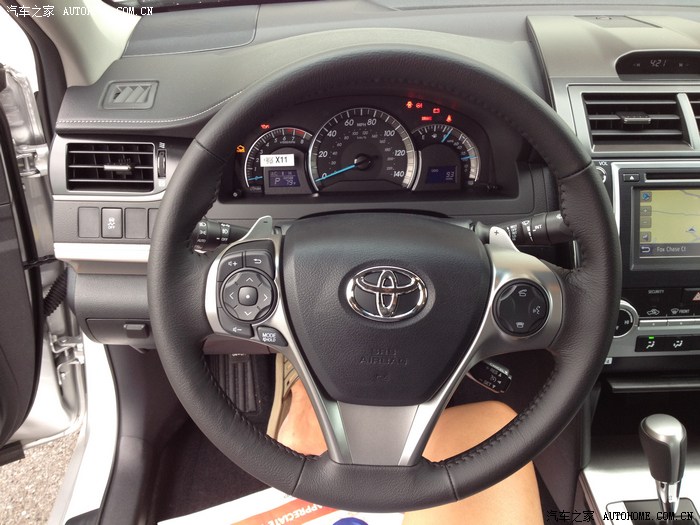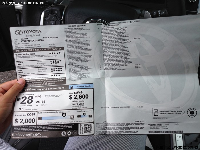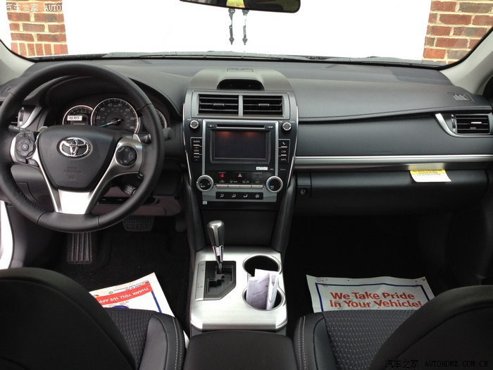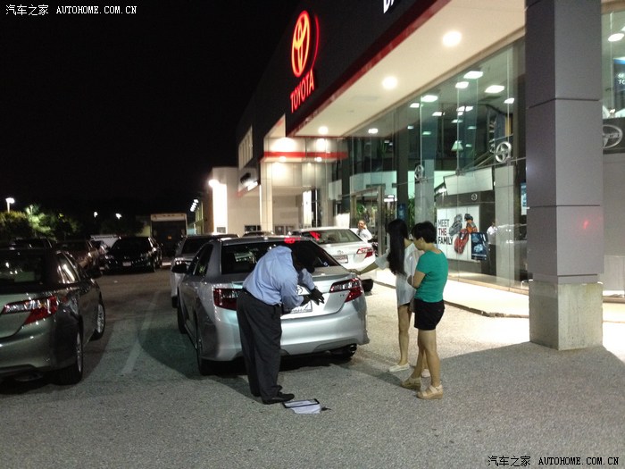 先说说提车的过程,话说一个周末午后,我去朋友家玩,正巧阿姨说要买辆车(之前的卡罗拉被撞坏了)给儿子用,于是就陪阿姨去买车。品牌先锁定丰田(不然范围太大,越选越纠结),先后去试驾了新普锐斯和凯美瑞,都是新车,感觉都不错,只是风格完全不一样~~普锐斯是混动,省油,好开,但是那个炫目的仪表盘把上了年纪的阿姨给吓着了,就像给年纪大的人一部IPHONE让他用的感觉一样,坐进凯美瑞就不一样了,一种熟悉的传统轿车的感觉,加速和刹车个方面也比普锐斯硬朗些,所以车型就锁定了凯美瑞~~但马上就纠结了,我们喜欢白色而且价位不要超过26000带导航就行,但是在现场的车里,白色的不是不带导航,就是带了导航配置超高(SE或者运动套件的)超过了预算,银色的车型有符合我们要求的,但是阿姨家另外两辆车都是银色的,实在不想再买银色的~~纠结了好久,差点一气之下就提高配白色了,最后还是理性战胜了感性,选择了银色,毕竟多出来3000多刀的配置没啥用,而且的儿子对车的配置不太感冒~~确定了车型后,紧接着就是杀价,谁让我们脸皮薄,最终只杀了1000刀,交钱提车走人~~~