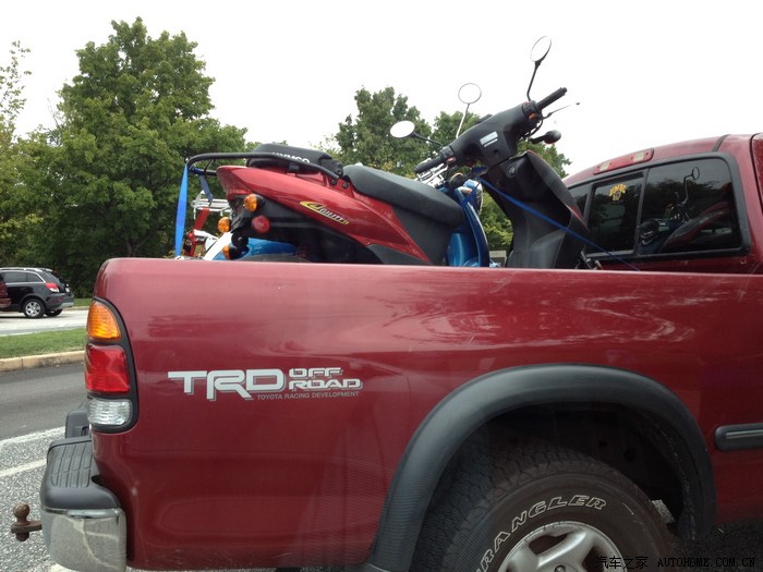 美国的家长送学生报到,老爸开着皮卡来,把儿子的摩托放下