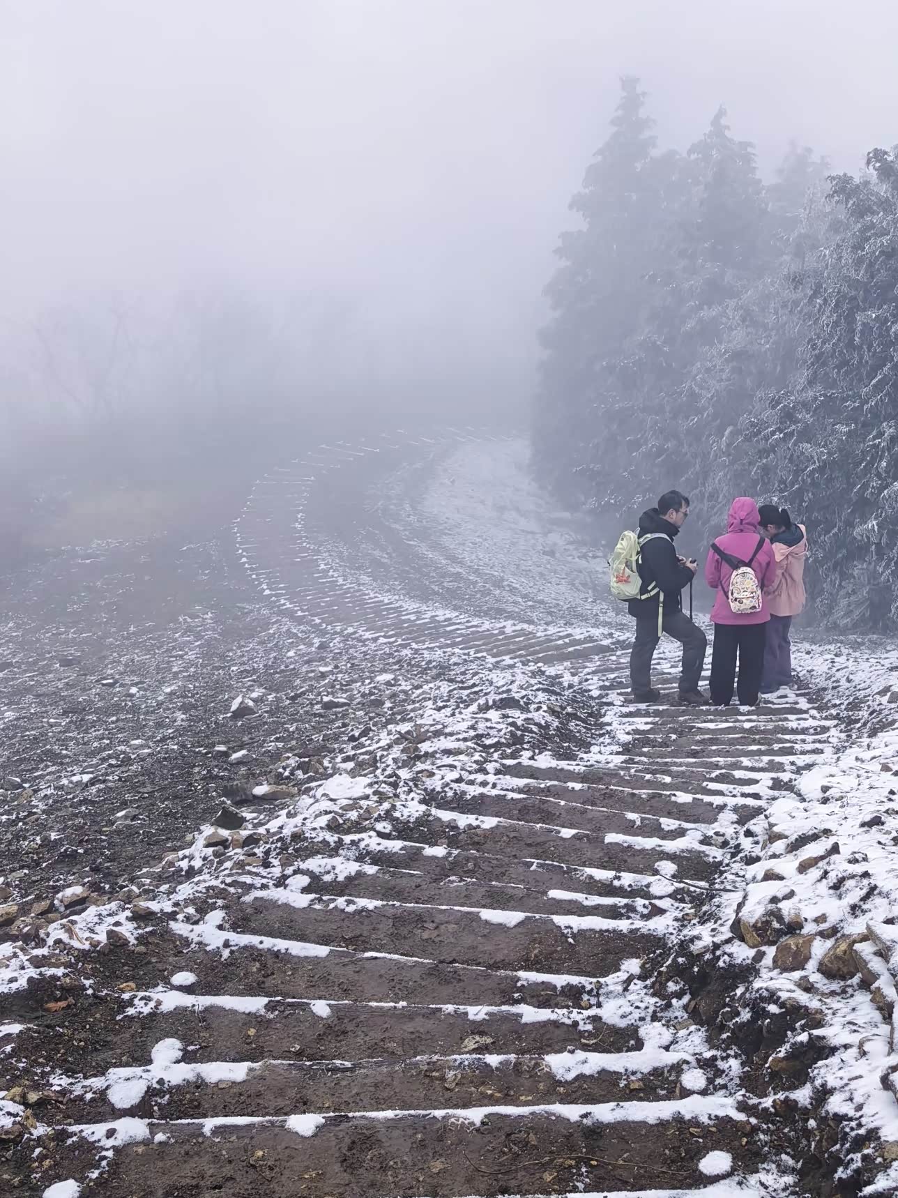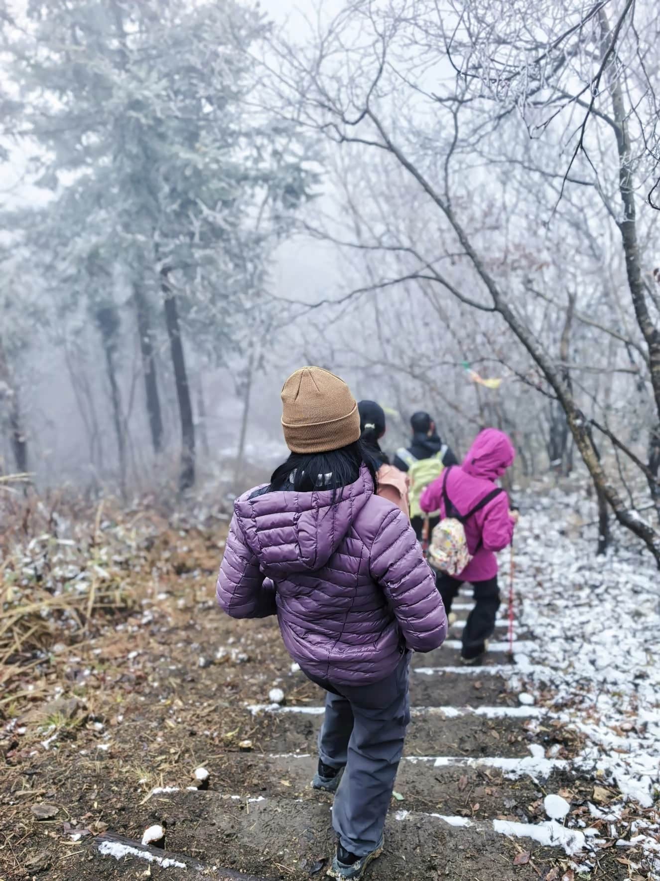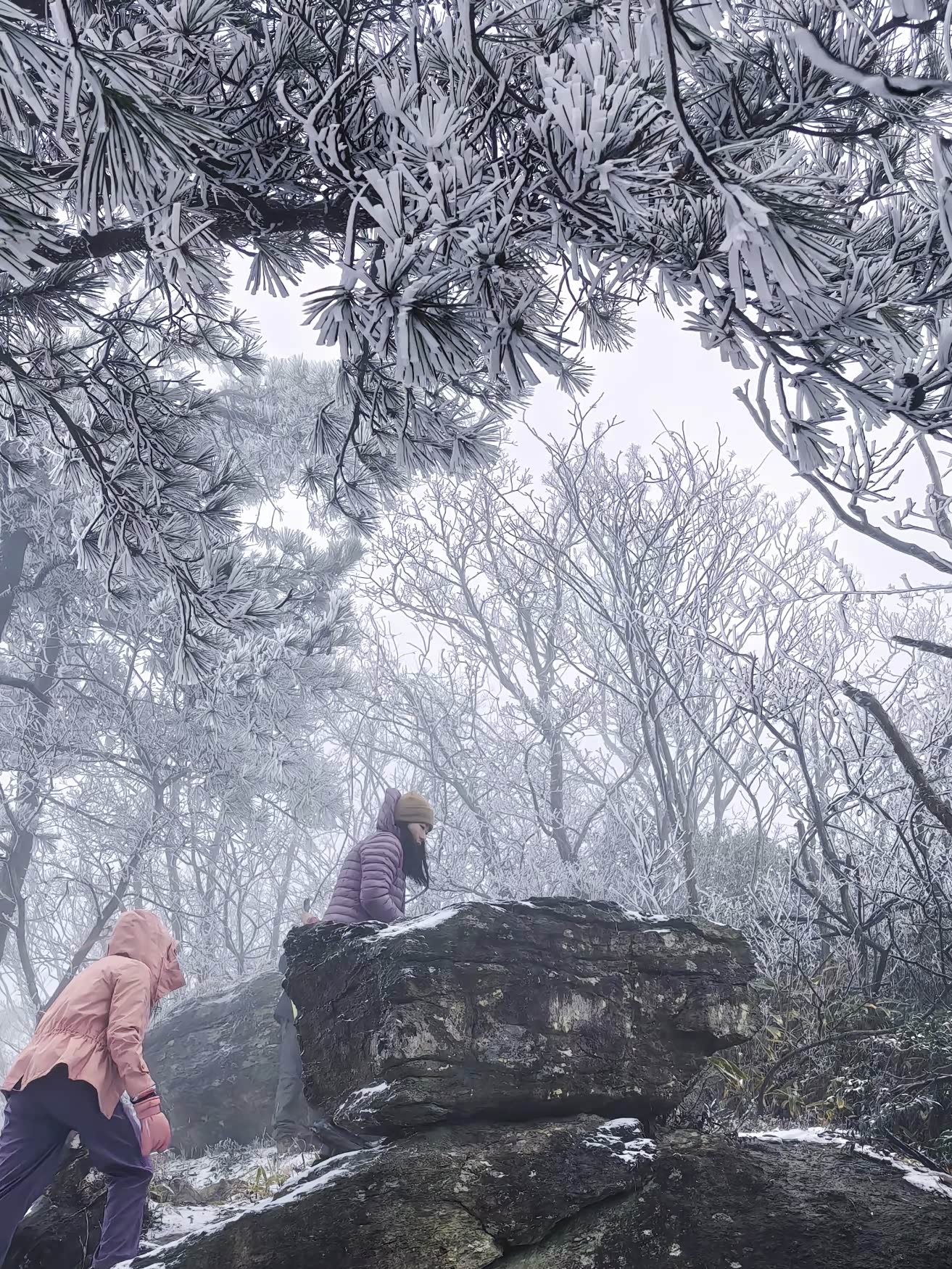 从奶部山到南坑村的森林步道,是这次行程的精华所在。我们一踏入步道,就被眼前的雾凇奇观震撼了。高大的树木仿佛披上了一层晶莹的冰晶外衣,每一根枝桠都毛茸茸的,玉树琼枝,宛如童话里的魔法森林。林间雾气缓缓流动,阳光偶尔穿透云层,在冰晶上折射出钻石般的细碎光芒,美得让人挪不开脚步。