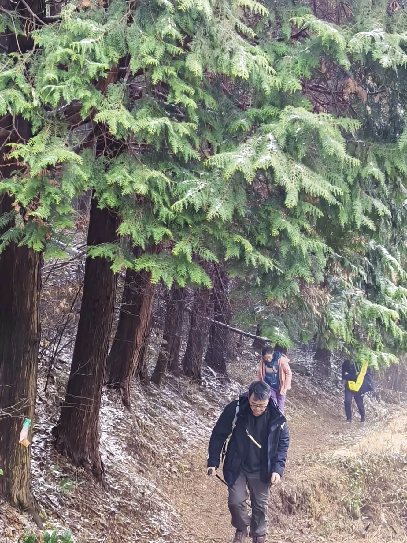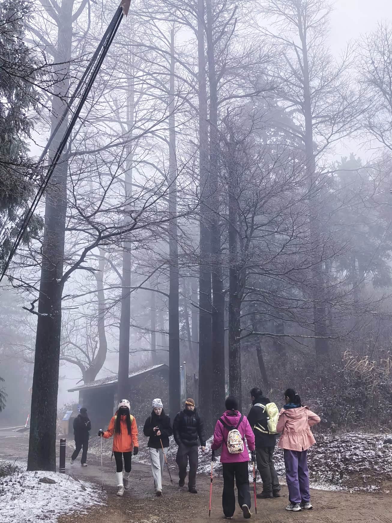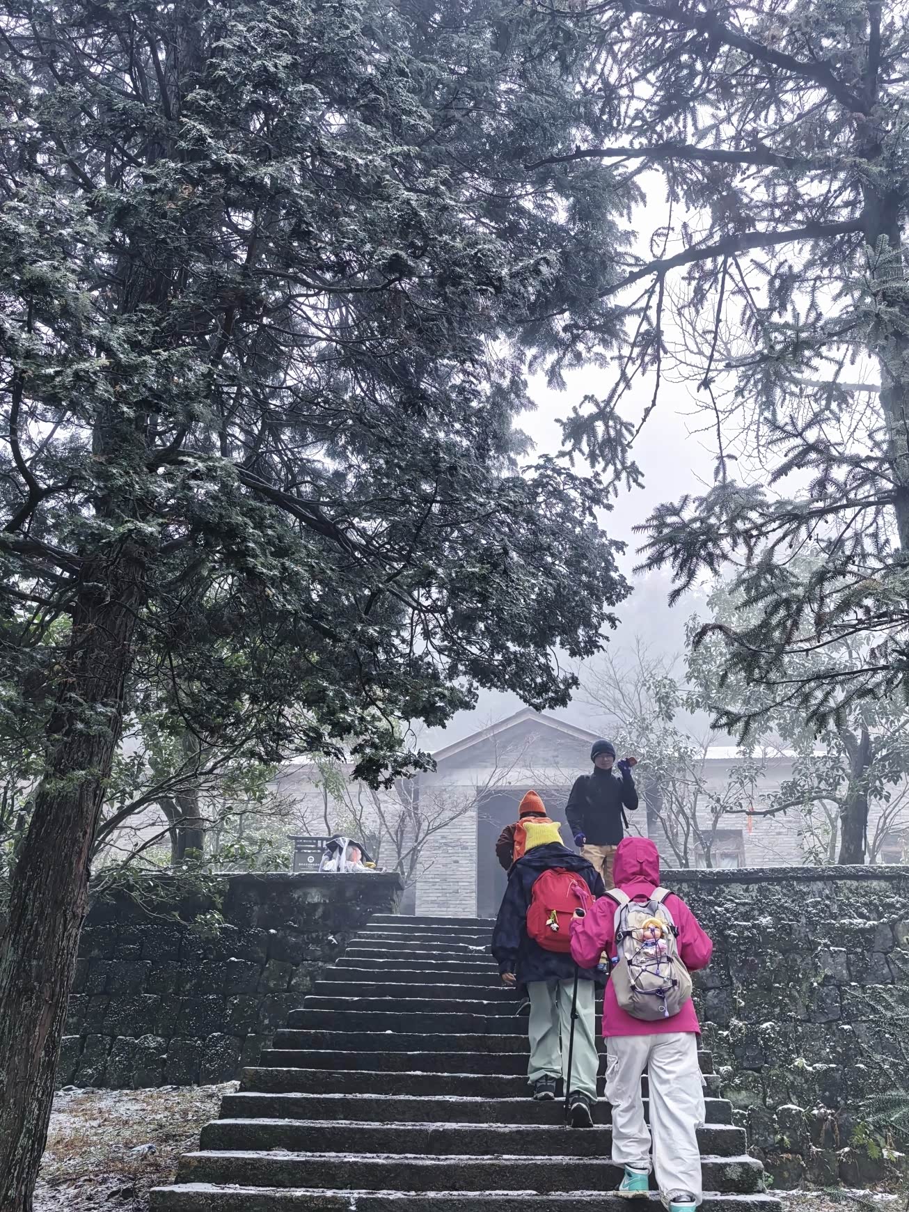 从奶部山到南坑村的森林步道,是这次行程的精华所在。我们一踏入步道,就被眼前的雾凇奇观震撼了。高大的树木仿佛披上了一层晶莹的冰晶外衣,每一根枝桠都毛茸茸的,玉树琼枝,宛如童话里的魔法森林。林间雾气缓缓流动,阳光偶尔穿透云层,在冰晶上折射出钻石般的细碎光芒,美得让人挪不开脚步。