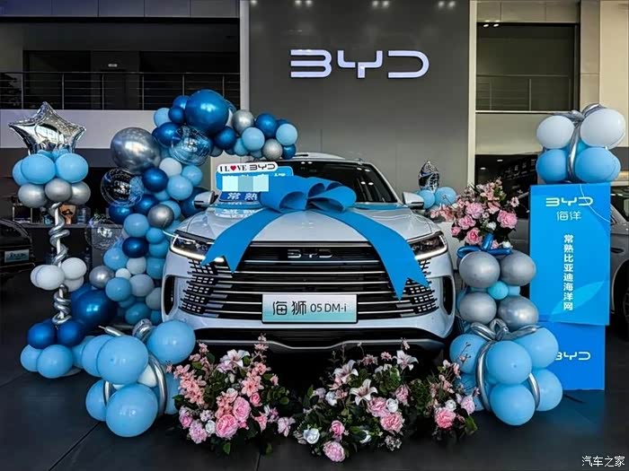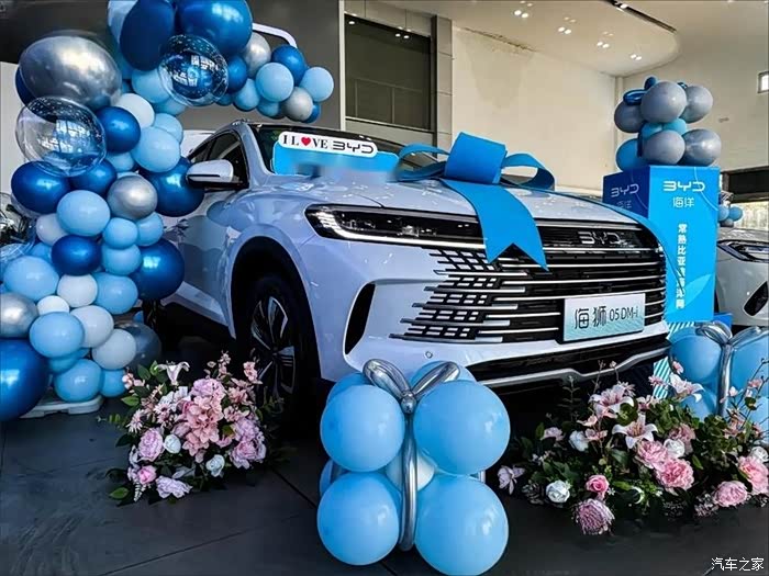 下定之后就是我仪式感满满的提车仪式了。销售和工作人员将我的海狮05DM-i装点的很漂亮,蓝色的气球漂浮在我的车旁,粉色的鲜花装扮着我的车身,工作人员都带着喜气洋洋的笑容。我站在车旁,销售为我递来一束鲜花,帮我记录着充满纪念价值的一刻,这妥帖而用心的服务让我提车的心情美上加美。