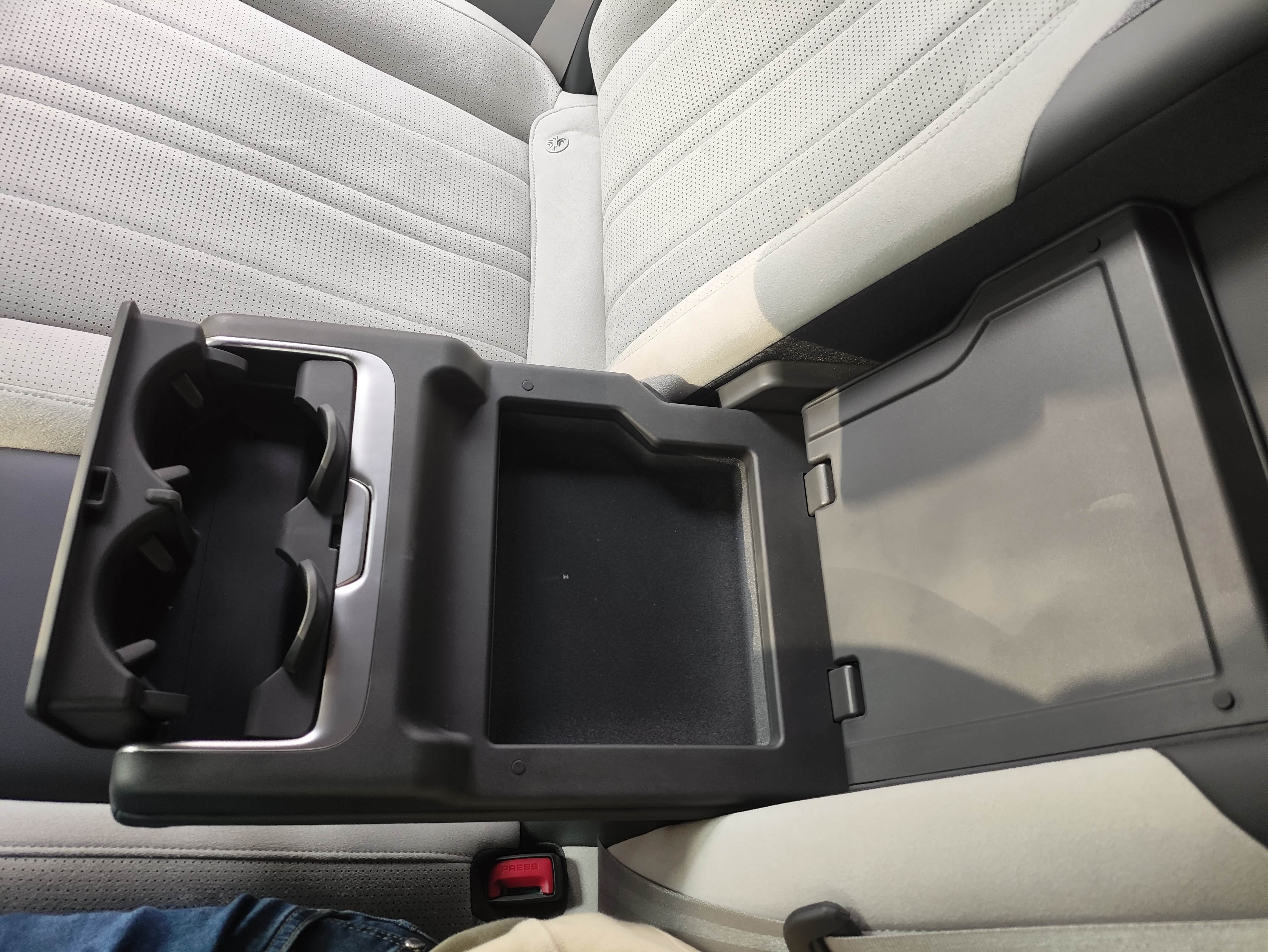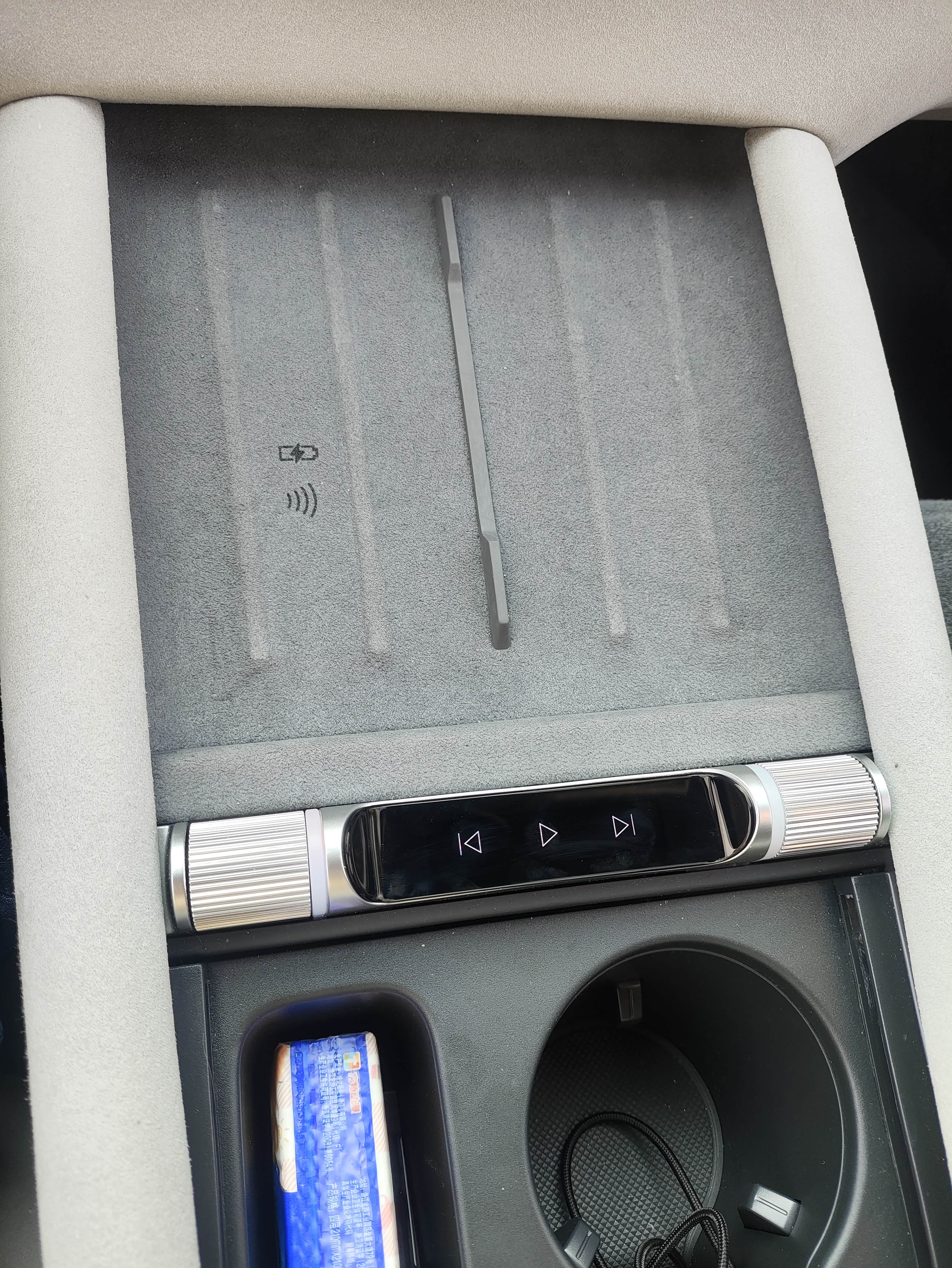 中控除了杯架和储物格外,还有一个手机无线充电板,两个实体滚轮和一块小屏幕,滚轮和小屏幕不但能控制音量和曲目,还能调节驾驶模式等等,功能齐全~