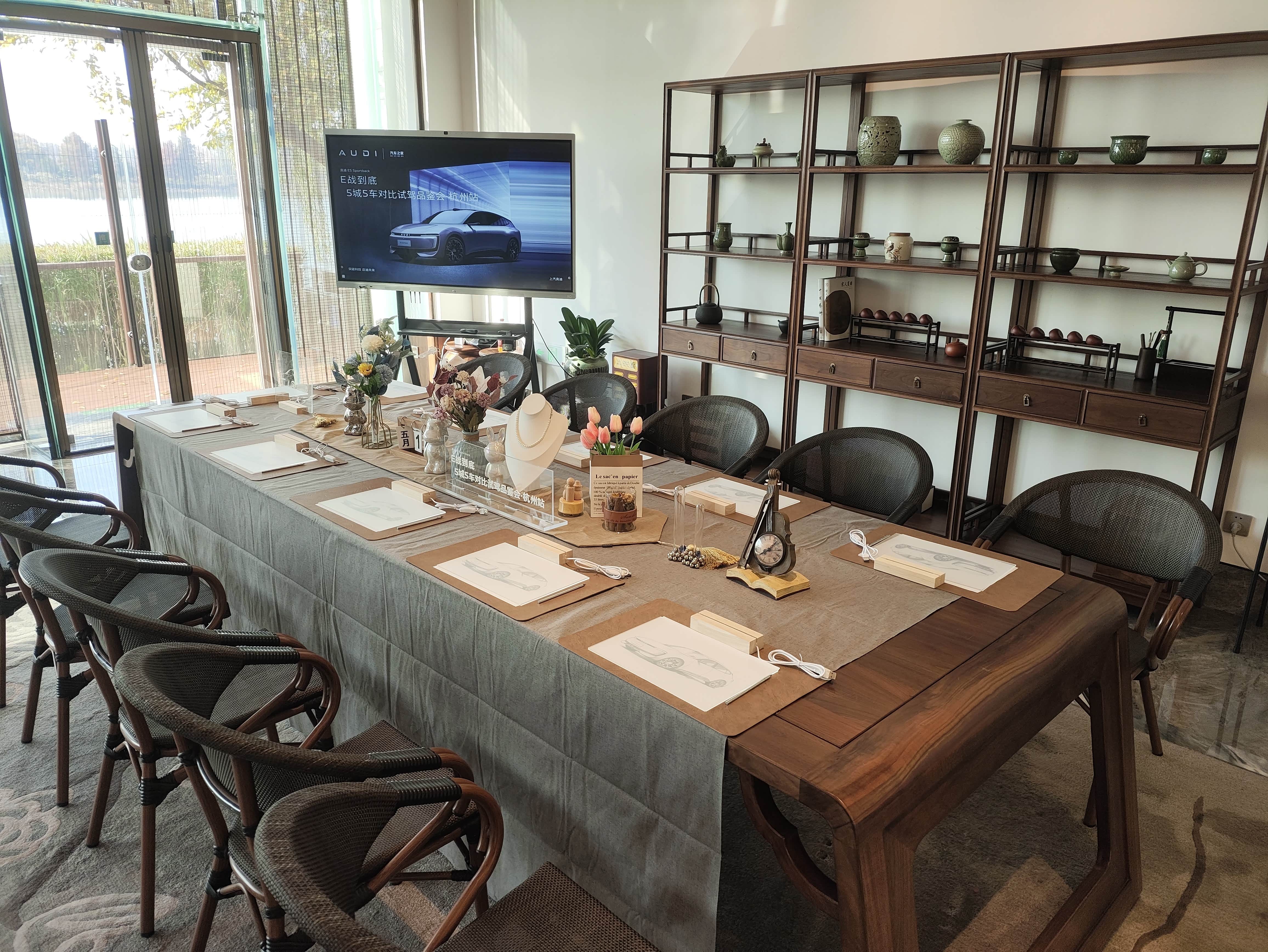 午餐后稍作休息,继续活动项目。由于嘉宾众多,于是分为两批,一批先去动态试驾,另一批去浮湘阁室内做手工体验。我被分在手工体验批,内容是做一件有趣的事——将奥迪E5 Sportback的流动线条,从公路上“剥离”,凝固于一块亚克力板中。手工老师跟我们讲:这不仅仅是一盏灯,这是用光重新解构一辆车的灵魂,以雕刻为笔以亚克力为画布,在光影的虚实之间再现奥迪E5 Sportback的动感型格~