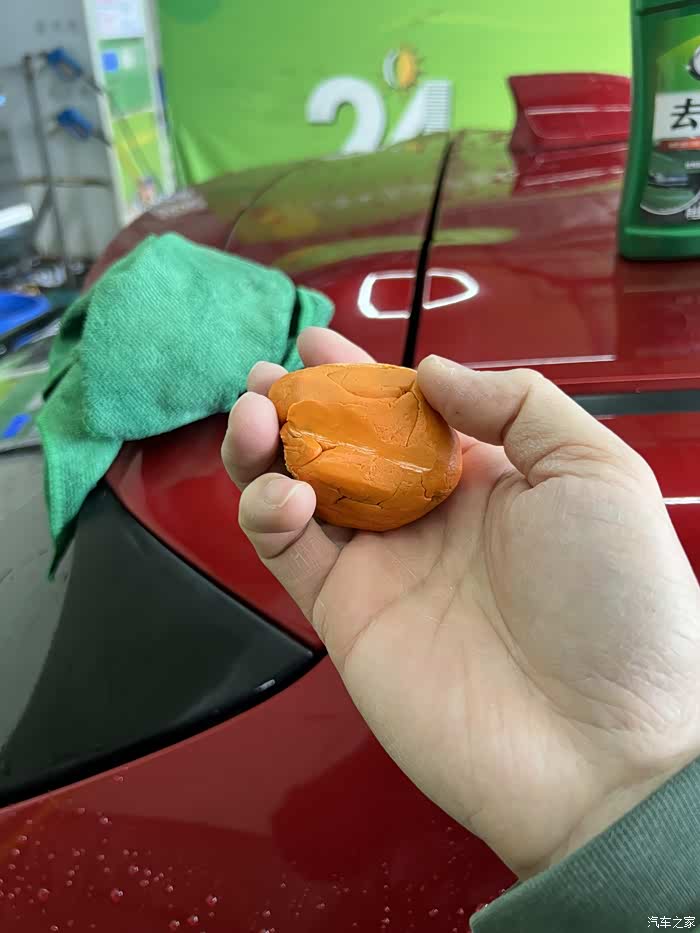 1、去污磨泥,这个东西主要是可以去除车漆表面的各种污渍,铁粉、油污、鸟粪、灰尘等顽固污渍等。因为经常跑高速和停在树底下,这个东西还是很有用的,用完整个车的表面光滑如新。明显感受到车漆上黏着的一颗一颗摸起来粗粗的粒子,不见了!用完非常光滑,而且接下来要给车子打蜡,所以先对车漆进行深度的漆面焕颜!不过施工的时候一定要注意,磨泥的时候要用润滑清洁剂,比如:兑水的洗洁精就很好用