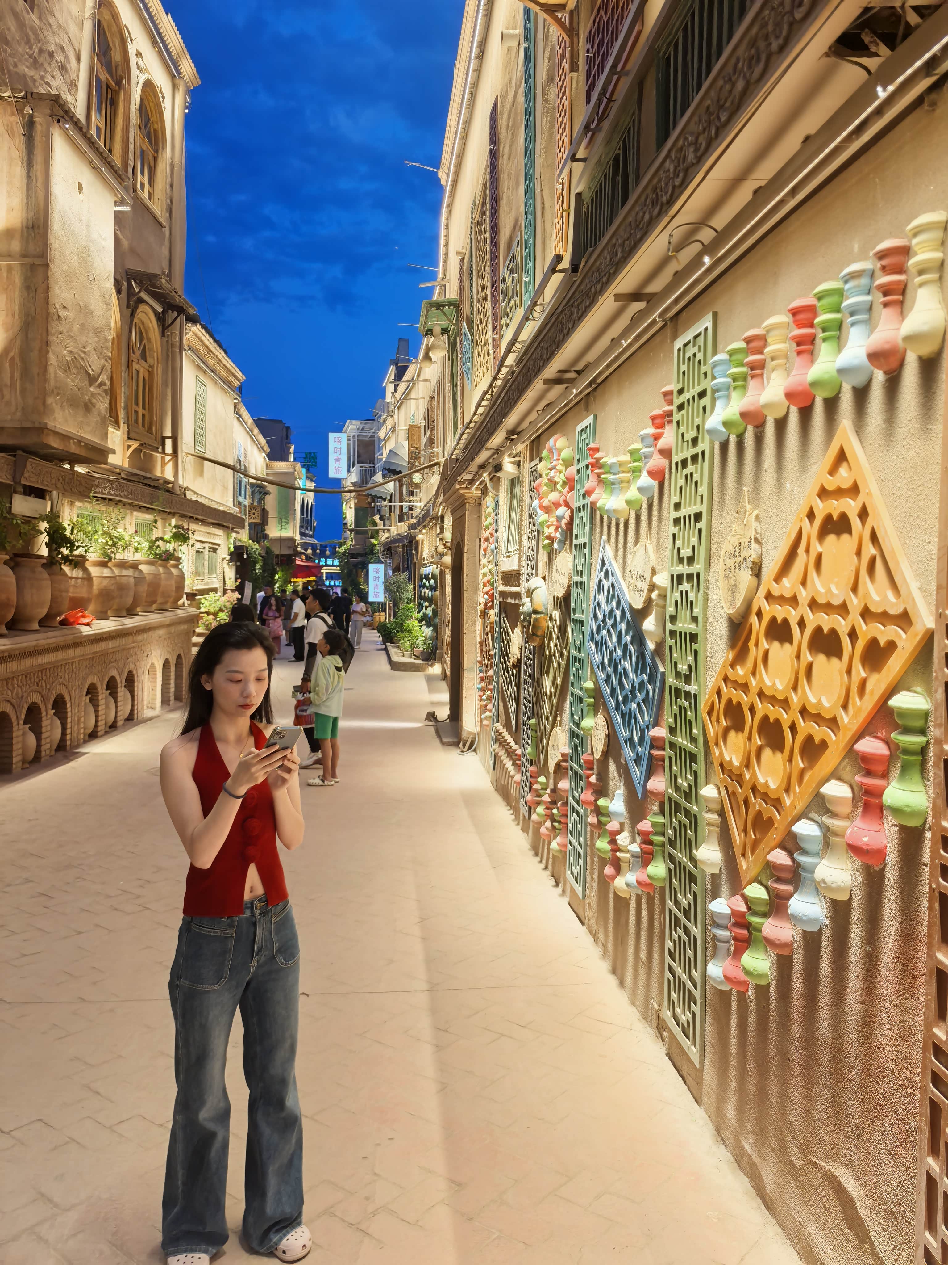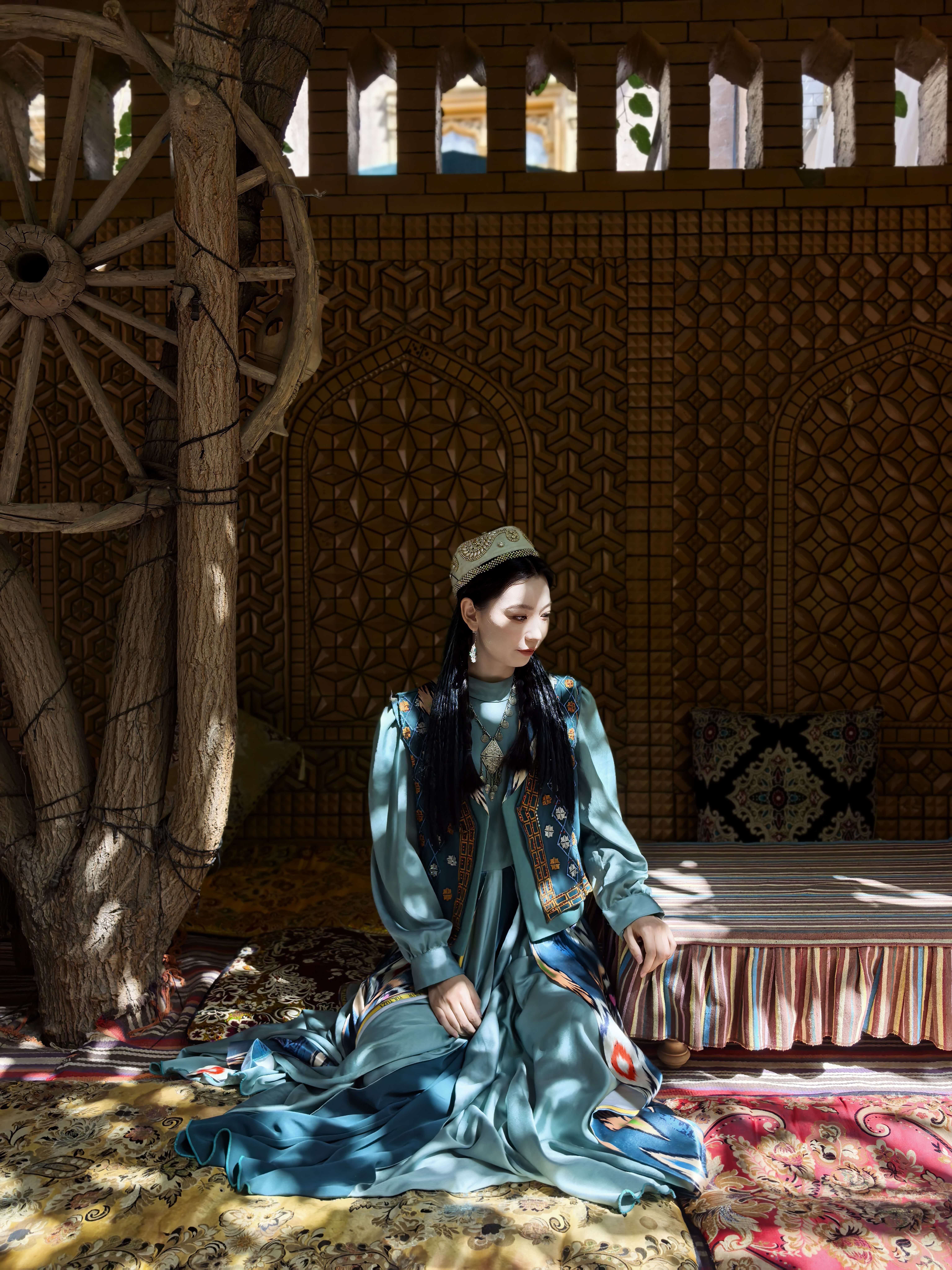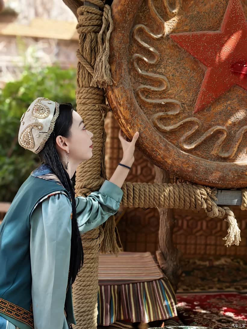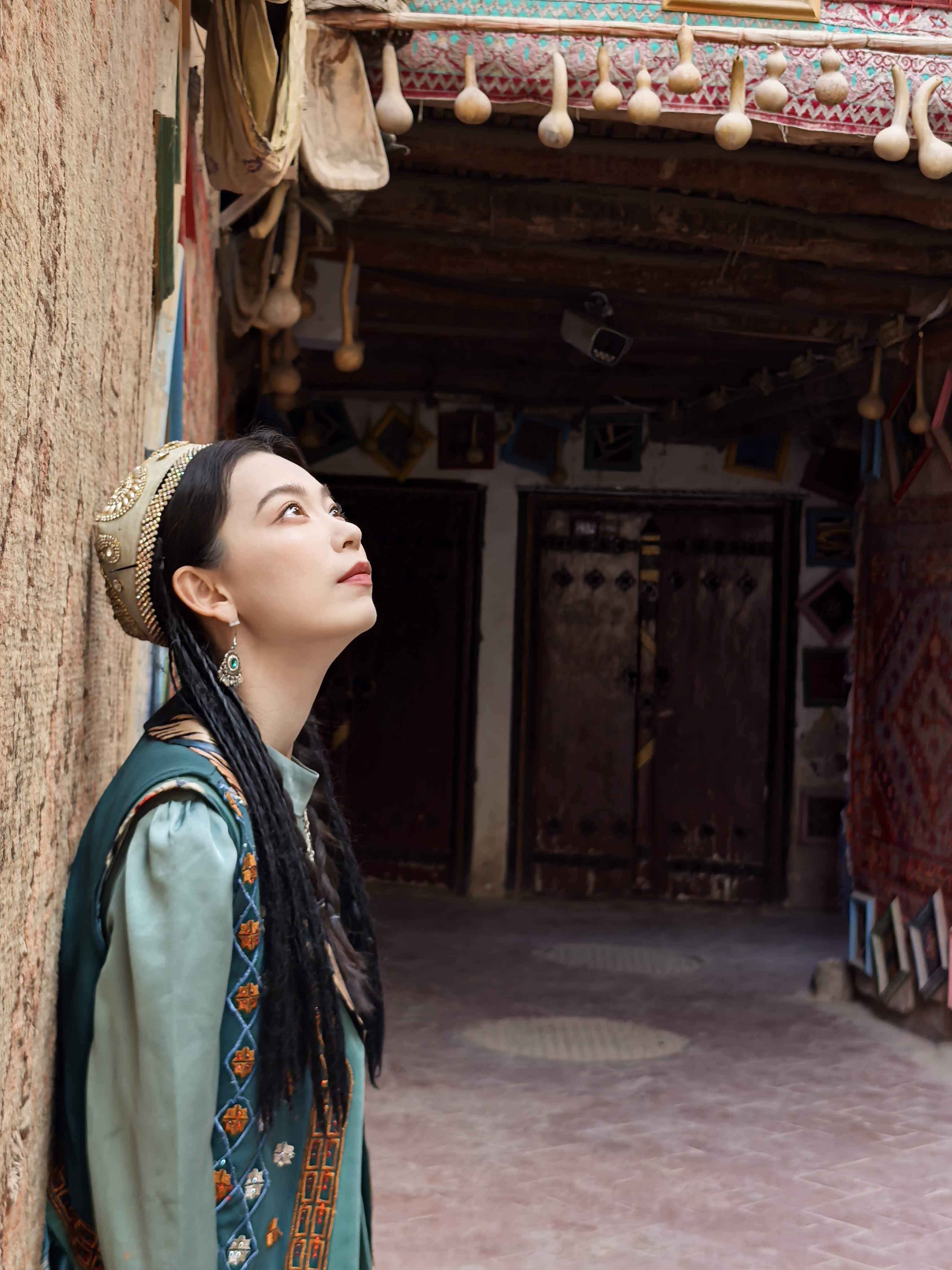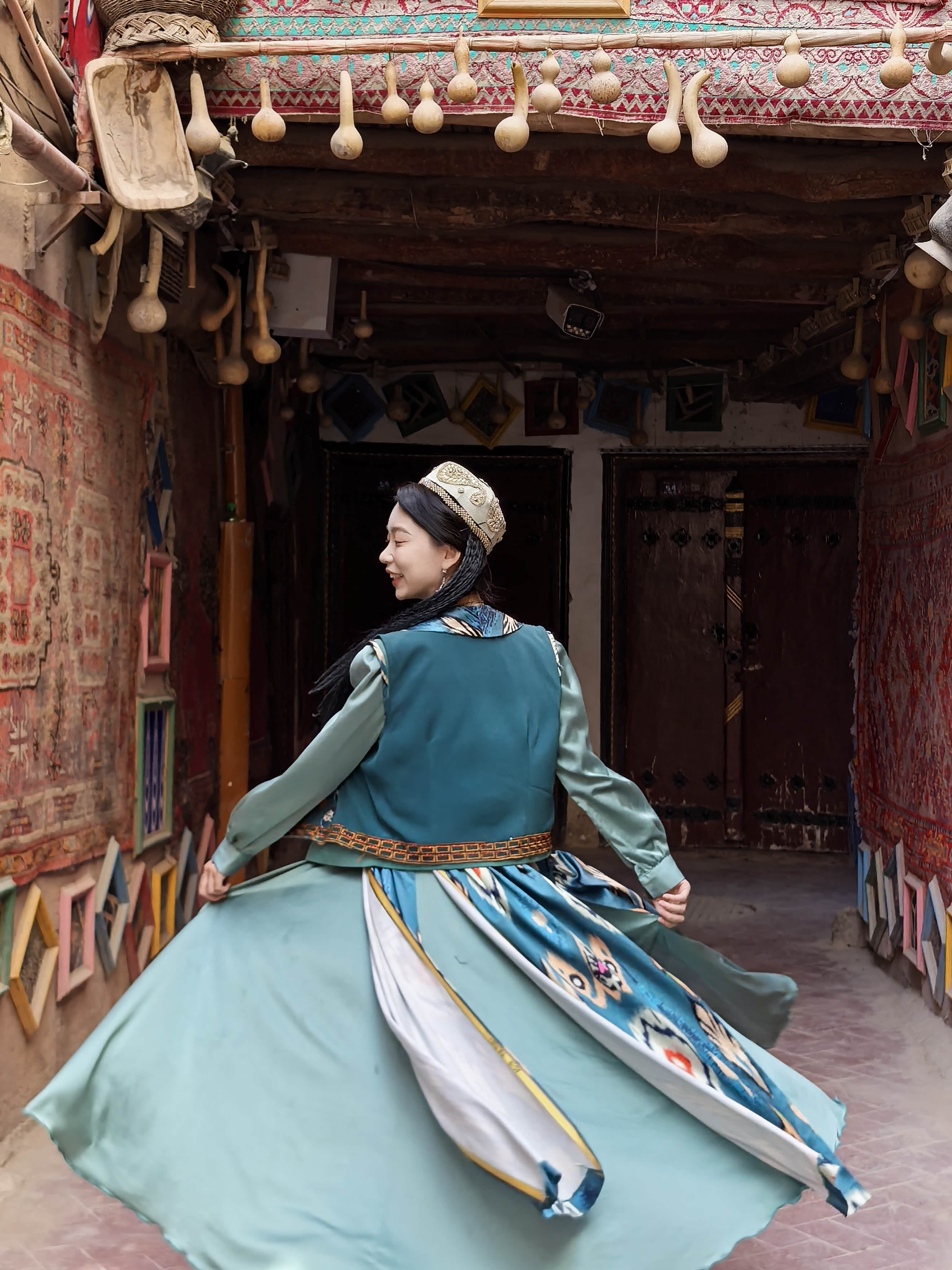 我也成了这画卷的一部分。在一家小小的妆造店,我让一位维吾尔族阿姨为我编织发辫,戴上华丽的头饰,眼角贴上金色的花钿。当厚重的艾德莱斯绸裙加身,站在镜前的那一刻,我仿佛不是“换装”,而是“唤醒”——某个沉睡在血液深处的、关于西域的遥远记忆,突然苏醒了。