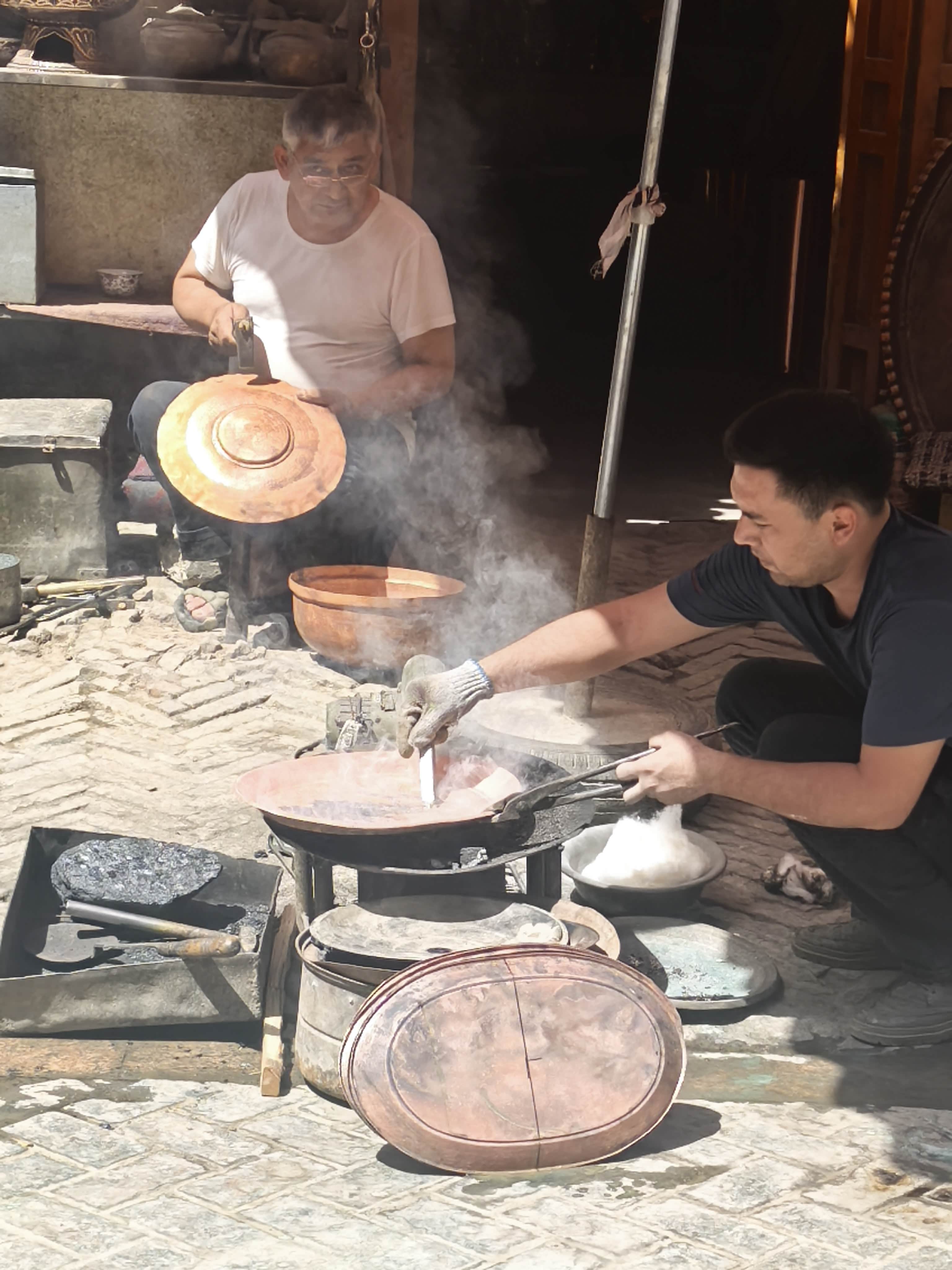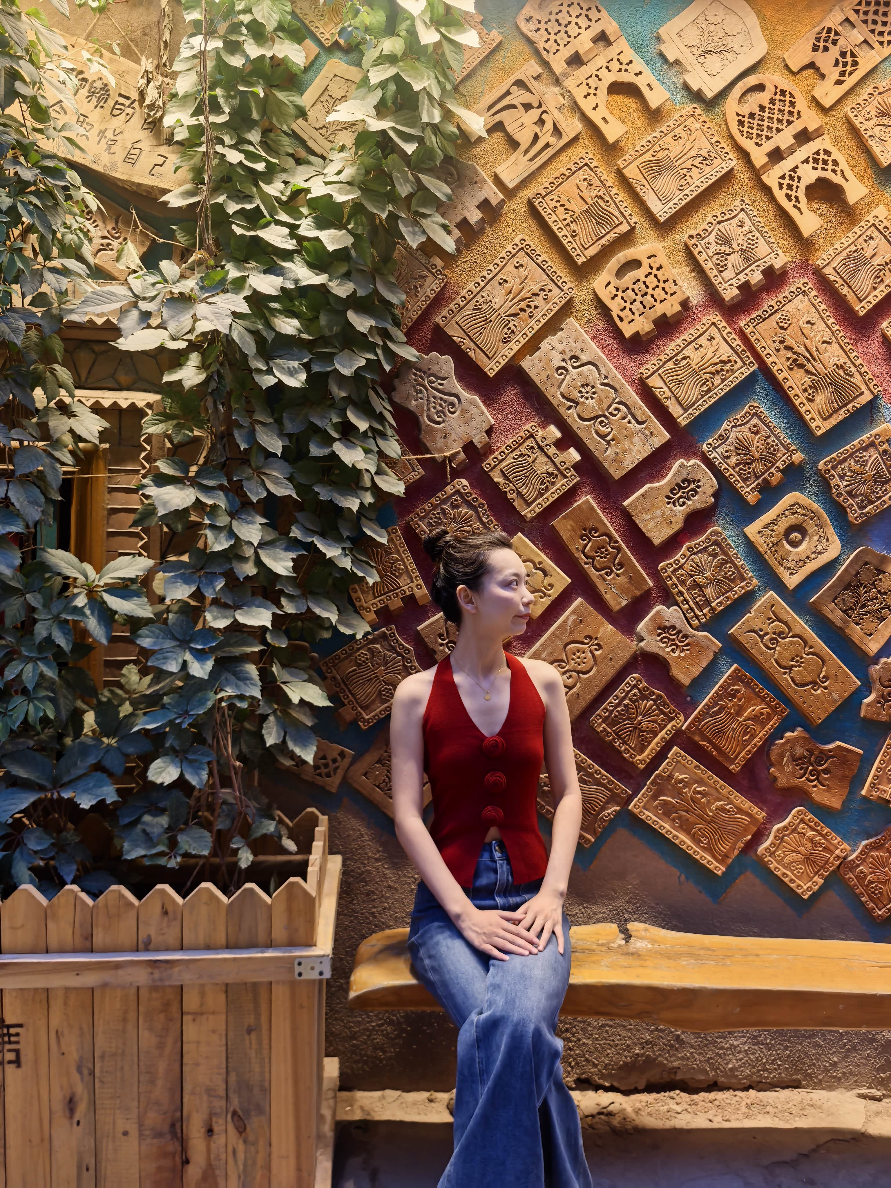 这里的气味是复杂的:烤包子的焦香、土陶的浑厚、干果的甜腻,还有阳光晒在黄土墙上的干燥气息。这里的声音是多彩的:驴车的铃铛、烤包子摊的吆喝、铜器铺叮叮当当的敲打、孩子们追逐的笑骂……各种声音混在一起,像一件巨大的、无形的乐器,在灼热的阳光里轰鸣。我们瞬间就从“旅人”,变成了这场盛大交响乐里两个迷路的音符。