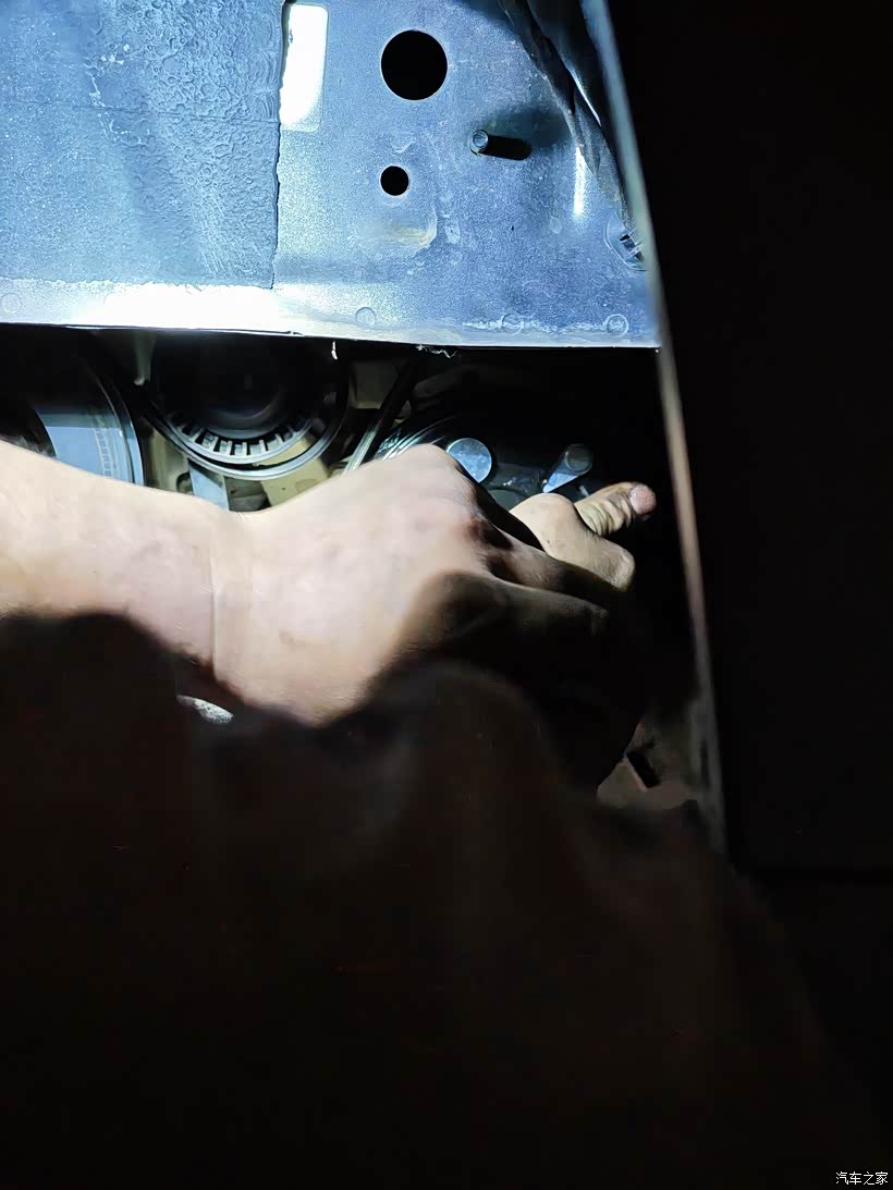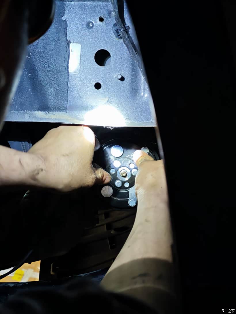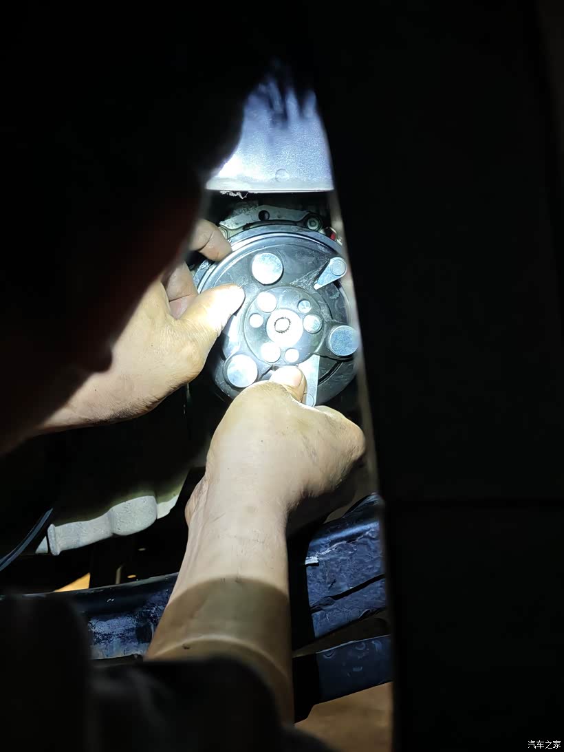 3. 拆压缩机:压缩机是用三颗螺栓固定在发动机上的,师傅用套筒扳手把螺栓拧下来,然后喊我搭把手,一起把压缩机抬了出来。抬的时候要注意,压缩机上有空调管路,别用力拉扯,不然管路漏了就麻烦了。