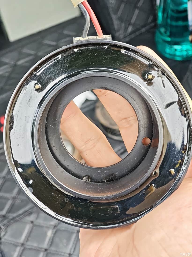 4. 拆解旧离合套件:接下来就是拆旧的三件套了,用卡簧钳把压缩机轴头上的卡簧撬开,然后就能把吸盘、轴承、电磁线圈一个个拆下来。拆下来的旧件我仔细看了看,轴承里全是灰尘和铁锈,滚珠都不顺畅了,吸盘表面还有深深的划痕,难怪会有异响,制冷效果也差。