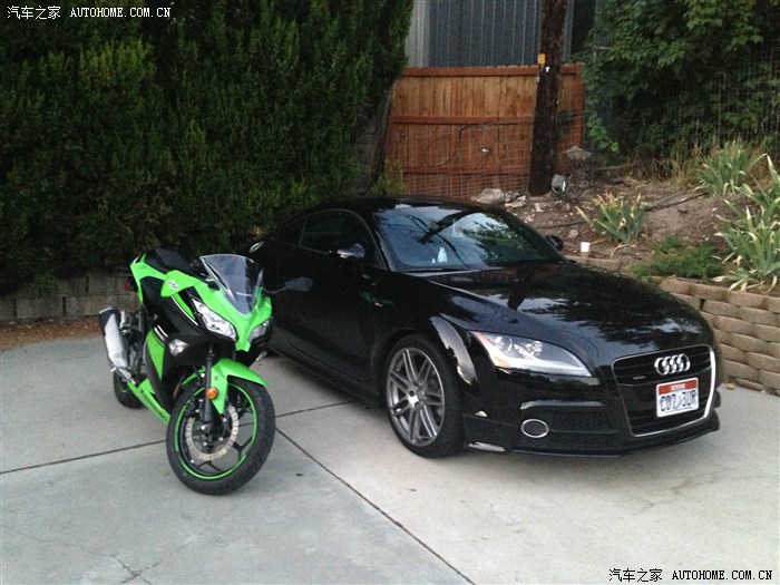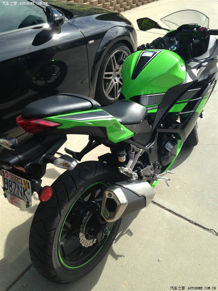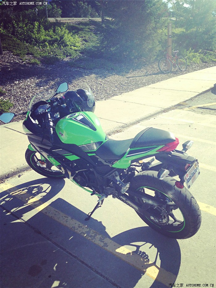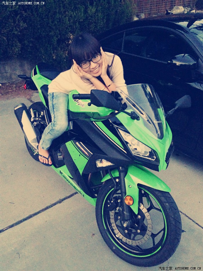然后去年10月份迷上了摩托车,然后买了一辆2013 川崎忍者300特别版,从同学那边买的,他换了zx10r,然后这摩托车开了700英里总共,他卖给我4000刀,他自己6100刀出门价。300CC摩托车加速跟TT差不多吧,跟女朋友比试过,加速差不多,不过ninja300急速就180km差不多了。