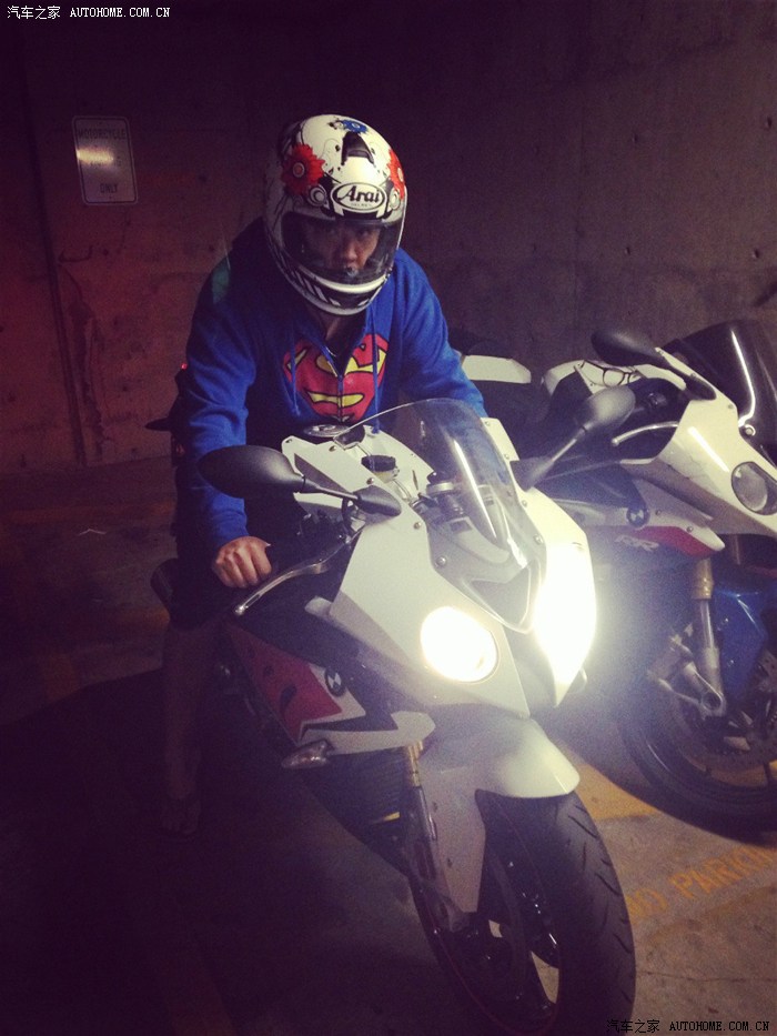 旁边那辆是公寓里其他人的,不过是老款的。 本人戴着头盔。 这辆摩托车是999cc的,跟老婆开着TT比了一下,不用说了。 s1000rr,2.6秒,0-100km,7.5秒,0-200km. 急速354km,不需要比试了。