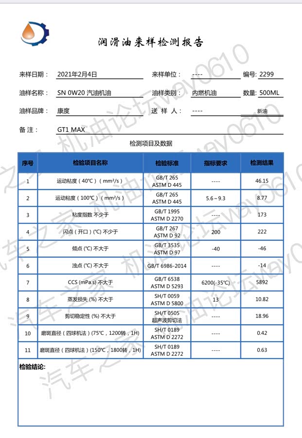 ,本次检测的是美国康度Kendall机油,康度顶级的GT1-MAX 0W-20,跟嘉实多一样,康度的顶级系列同样主打钛流体技术,根据国外的元素分析,康度的钛含量要高于嘉实多极护。我也在国外网站查到过几款康度机油的实测数据,印象中非常一般,纯第三类基础油调配,蒸发损失也很高。今天有机会测到他的顶级GT1系列0W20,一起看一下到底如何