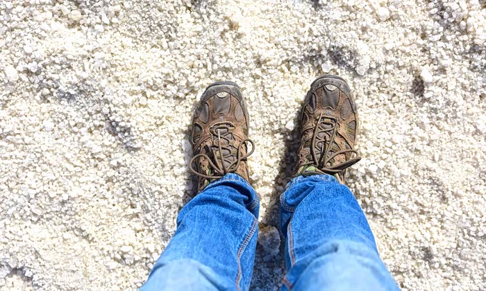 双脚站在满是盐粒子的地面上