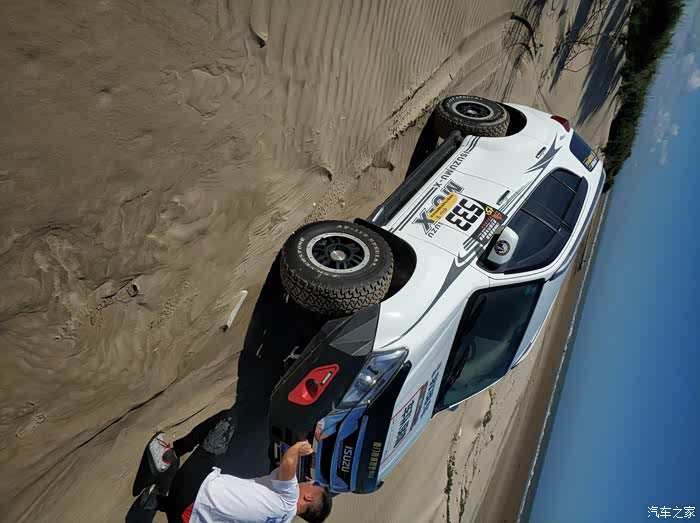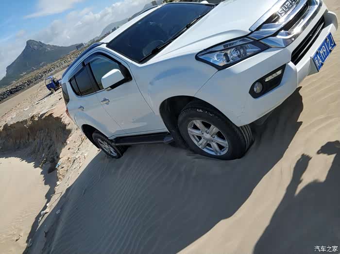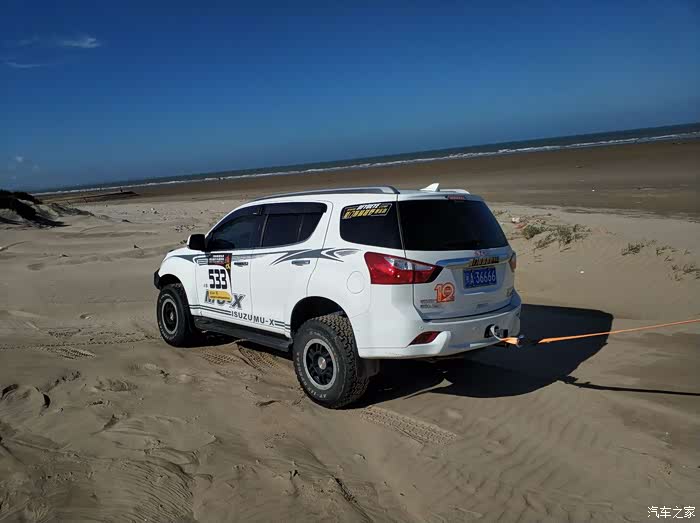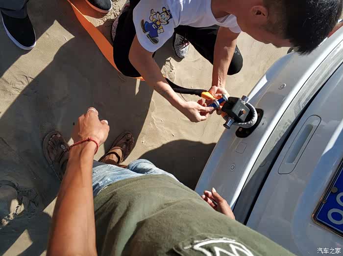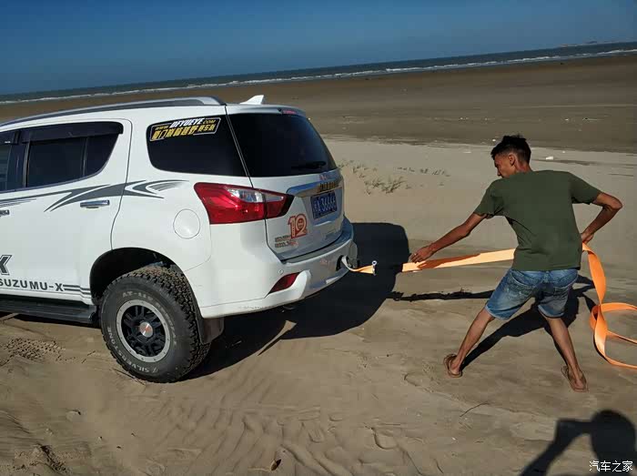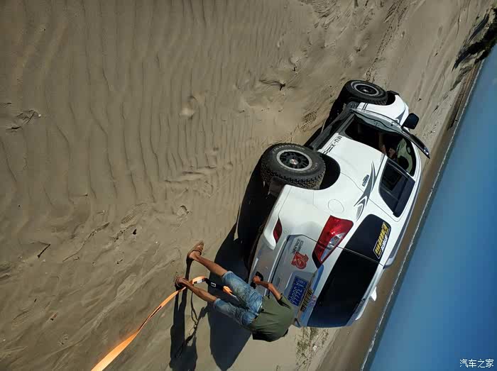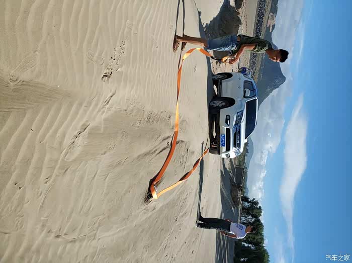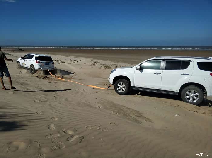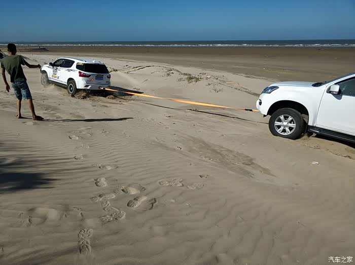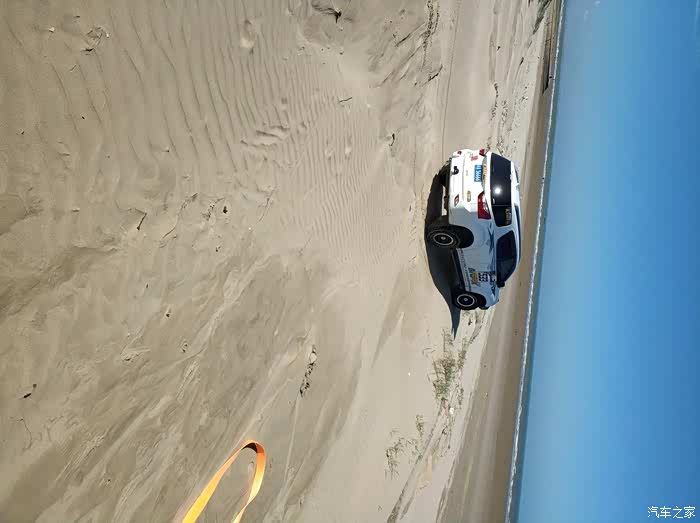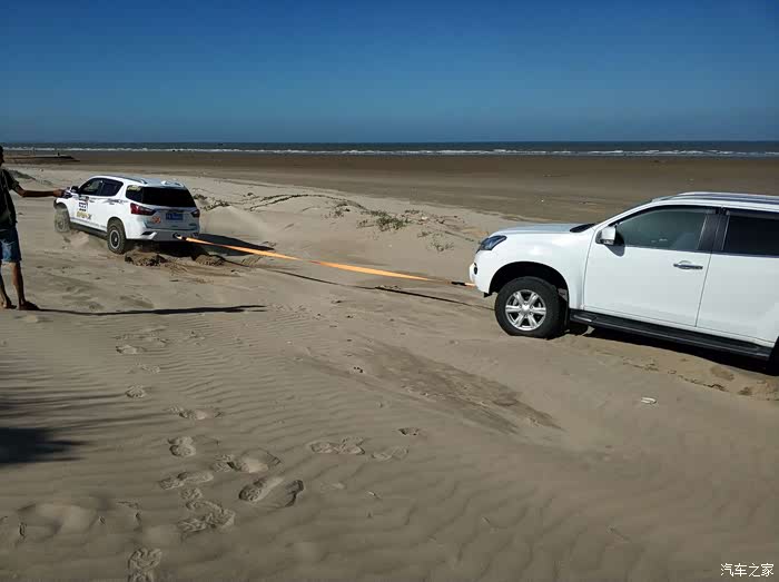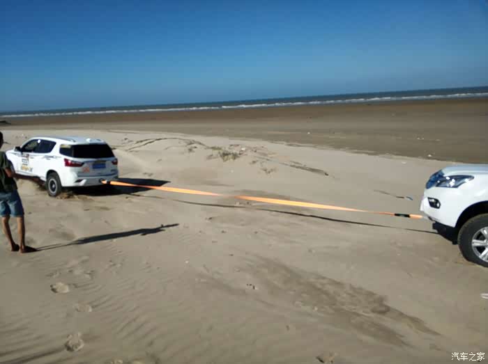 第一站任务:冲沙。长乐来了很多趟,这个沙滩倒是第一次过来,很干净的沙子——没有开发的自然沙滩。进沙场有个坡,太陡了,个人感觉上不去,标哥一马当,挂低四前进。但是边上太软了,车一下子陷进沙里,标哥猛踩油门,还是爬不出来,可能是车胎没放气。戴总于是从边上绕过去,进行拖车操作。两车同时发力,终于脱困。