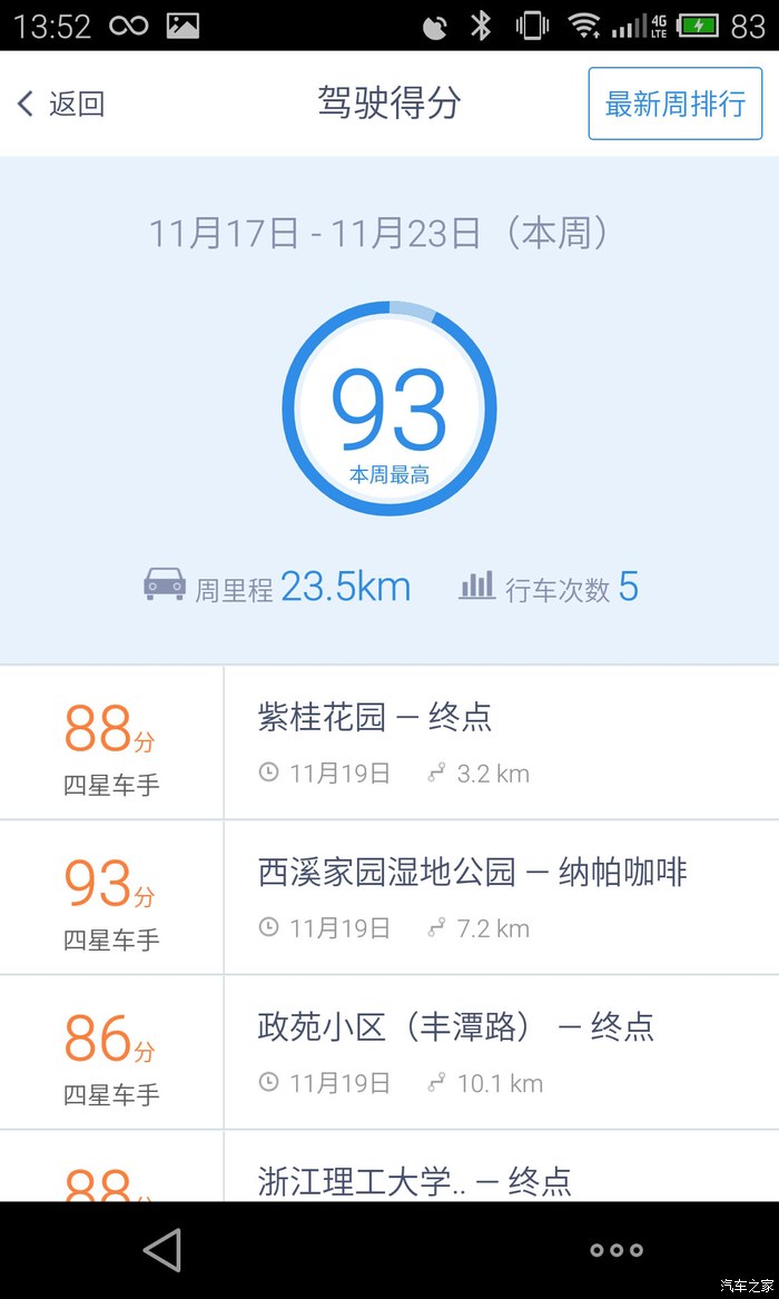 3)最关键的驾驶。我们当天晚上7点多加装完装潢后,直接开车上高速从宁波到杭州,动力感相当不错,最高速128,平均时速102,比较安静。平均百公里油耗5.1。这些数据我因为在方向盘地下的 OBD 接口插入了腾讯路宝,通过蓝牙连接手机实时获得汽车驾驶数据的,当然也可以用来扫描车身的安全状况。不知道其他车有没有,在等红绿灯踩下刹车后,再向下踩一下,就会出现 HOLD模式,这个时候刹车就不需要踩了,这个 little big details 非常喜欢。挂档拨片在方向盘右上方对我来说也比较适应,按一下就是 P 档。在市区使用(其实可以一直使用)的 ECO 节油经济模式也很不错,红灯停车发动机转速直接降到0。因为是实习期的马路杀手,我在市区开得很谨慎。个人驾驶最大的问题还是在倒车。。。。不会倒。。。。-_-!!! 有在杭州城西附近见到我的,大家记得让我下,不要狂按喇叭,哈哈。