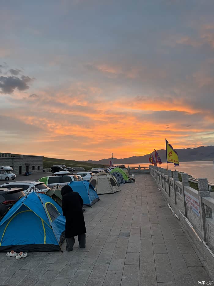 迎着晚霞,赛湖边露营