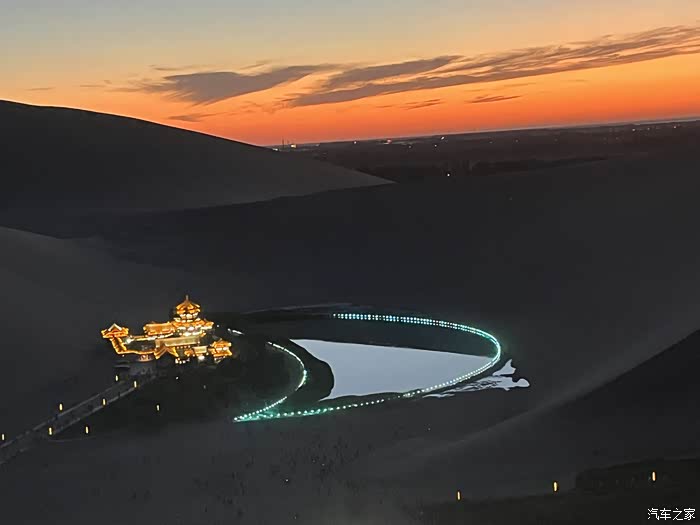 夜幕下的月牙泉,像一弯被遗落在沙漠里的月亮