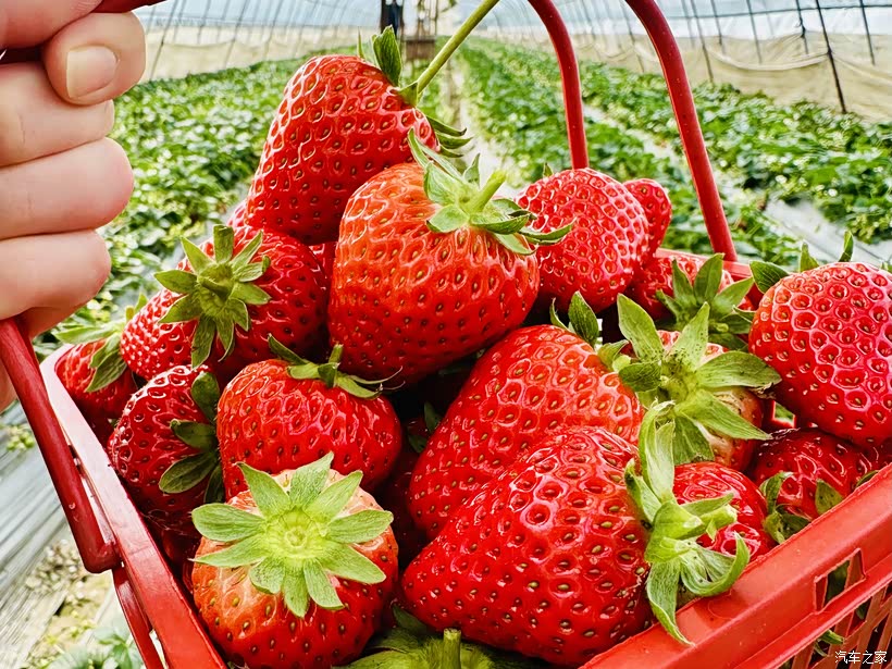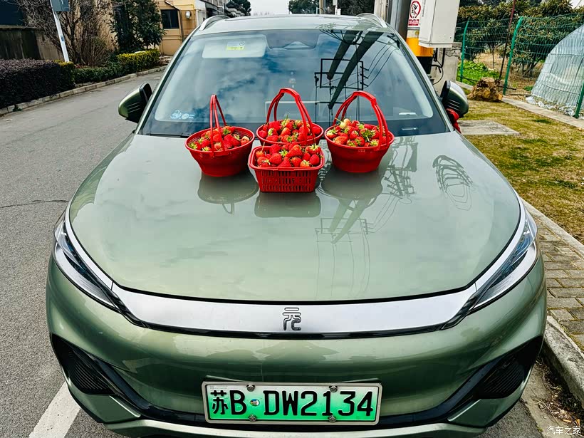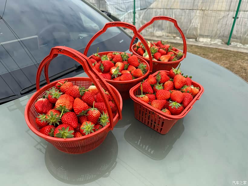 一边采一边吃,很快我们就收获了满满四大篮草莓,红彤彤的看着就喜庆。把草莓摆在小元的车头展示下我们的成果吧。绿色的车身搭配红色的草莓,红配绿的撞色感十足还挺好看。小元的“元气绿”遇上草莓的“新年红”,就像把新年的生机与甜蜜都装在了一起仪式感拉满。