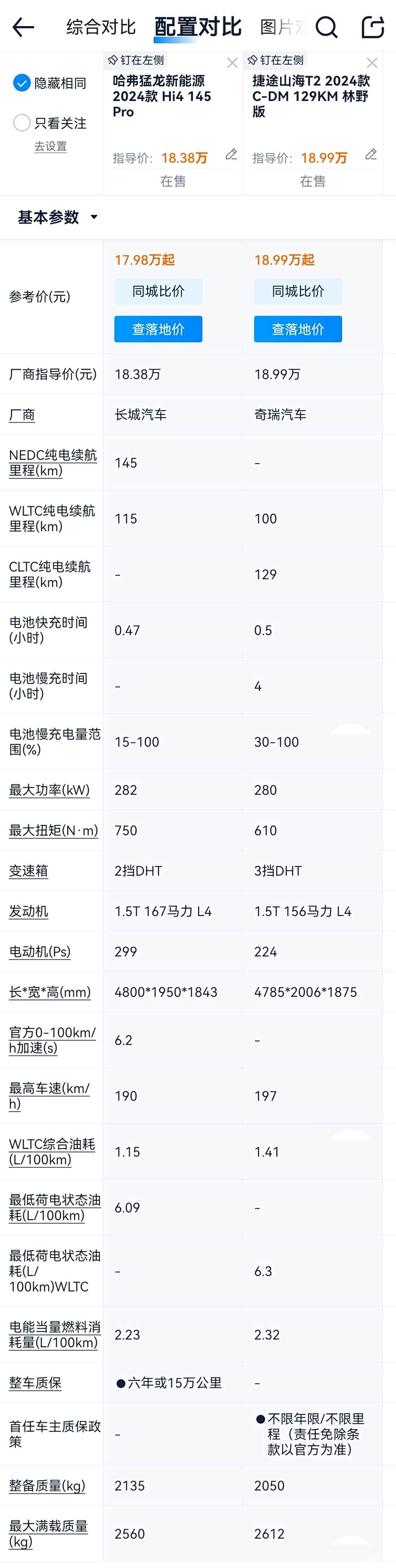 总的来看,两者除了猛龙的四驱和选装的差速锁有显著的优势,其他配置我觉得基本相当,至于外观则仁者见仁智者见智了!但是猛龙如果不极致追求续航,完全可以选102por的版本,这样能比捷途省1万,也算是一个小小的优势吧!