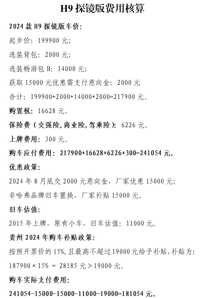 经过试驾二代哈弗H9之后,我和销售大概谈了一些首付,月供,比如那个现金礼,2000元订金就能抵12000元购车款,这优惠力度,简直不要太大。还有置换礼,如果是哈弗H9的老车主,置换补贴能有20000元;就算是其他品牌的车主,置换补贴也有15000元,细算下来的优惠政策,我首付只要交10万出头就行了。它现在有7.2万元24期0息贷款的政策,然后后面就跟家人商量这事,只是先放定金,听销售说了,提车大概半个月就可以提车,所以还是蛮期待到时候提车的心情。