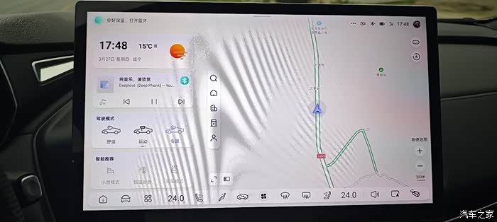 仪表盘方面也进行了优化升级,新增了一个时间显示,在导航的时候可以更加方便的知道时间,以前导航的时候要去仔细寻找时间,现在在小屏上也可以看到。然后我发现在中控屏上右下角新增了音量调节功能,这个比之前展示更加直观、操作更加方便,以前调音量都是等导航播报和放音乐的时候调整,感觉比较不方便,现在可以直接在桌面调整导航、音乐、语音助手音量,是比较人性化的更新了。