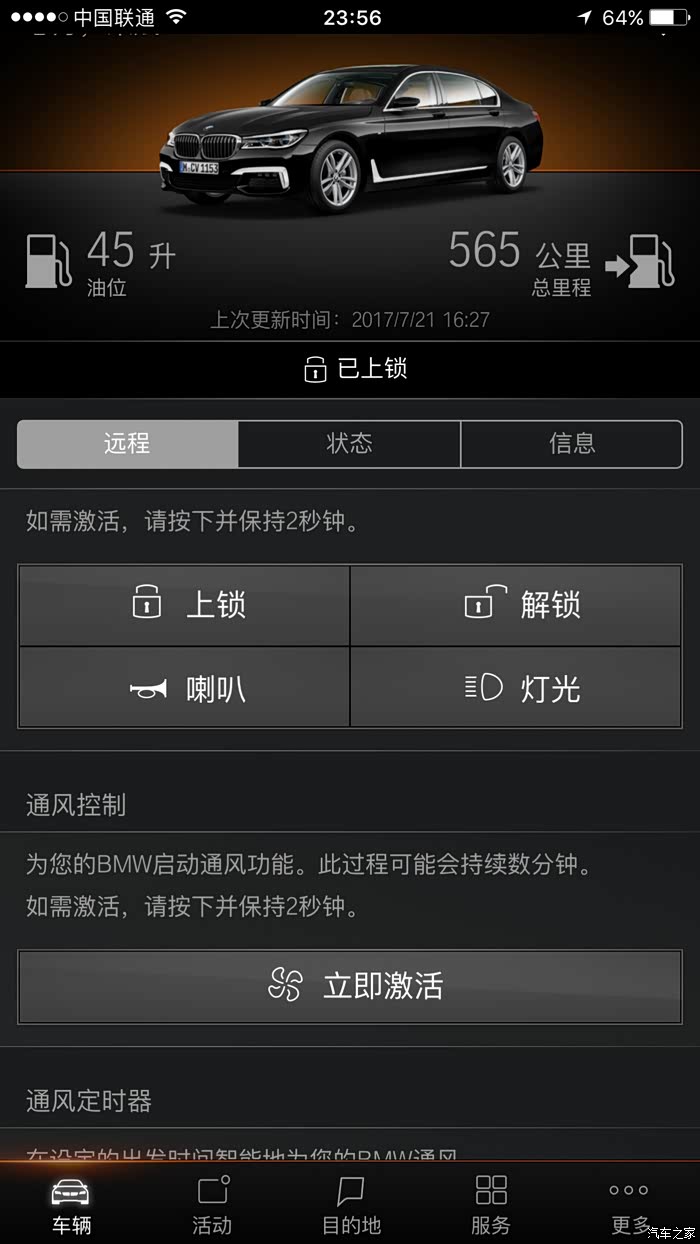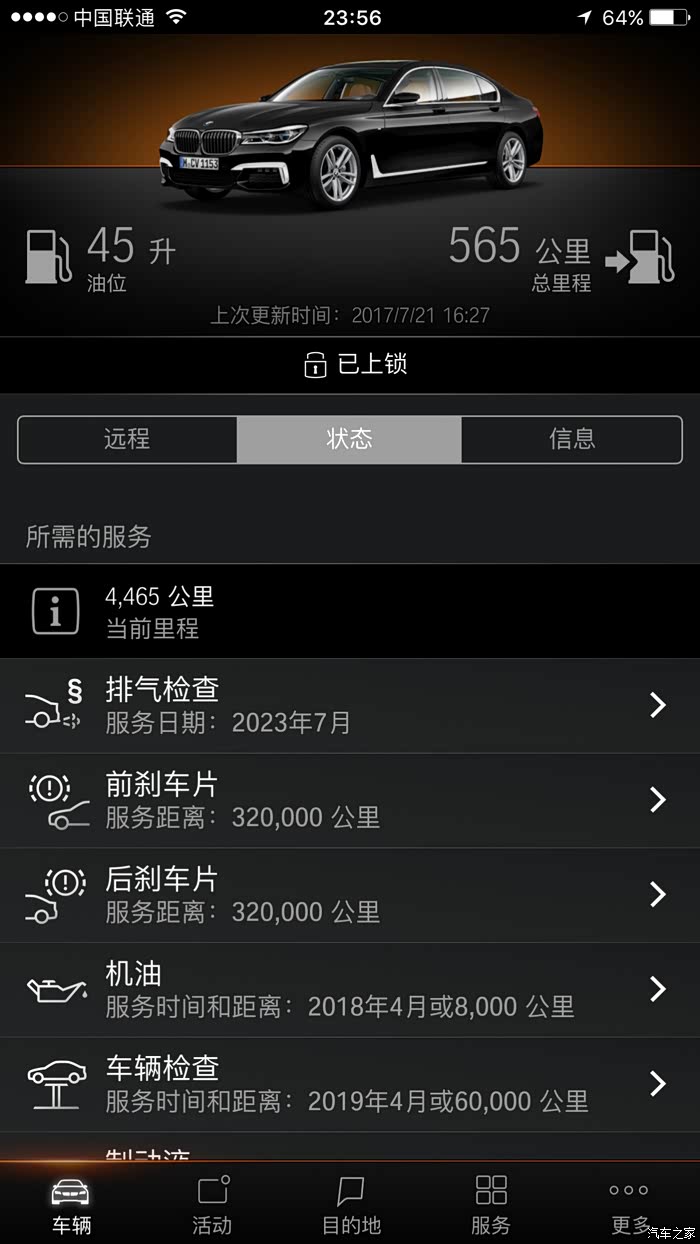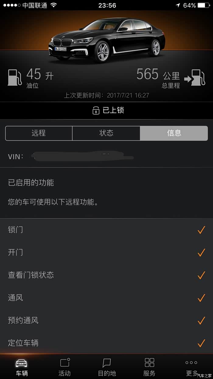 *云端互联:这个好!手机上就可查看油量等等诸多车子状态信息,比如远程控制开关窗锁车预通风等,有的车还可以远程查看3D停车图(我这车2月生产应该是ID5系统,往后的ID6系统就应该可以,不知以后能不能升级ID6?)。车的基本情况手机APP一目了然。不爽的是网络慢,听说宝马通信是联通3G,能换4G就好了,有车友能否换过呢?