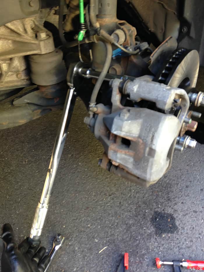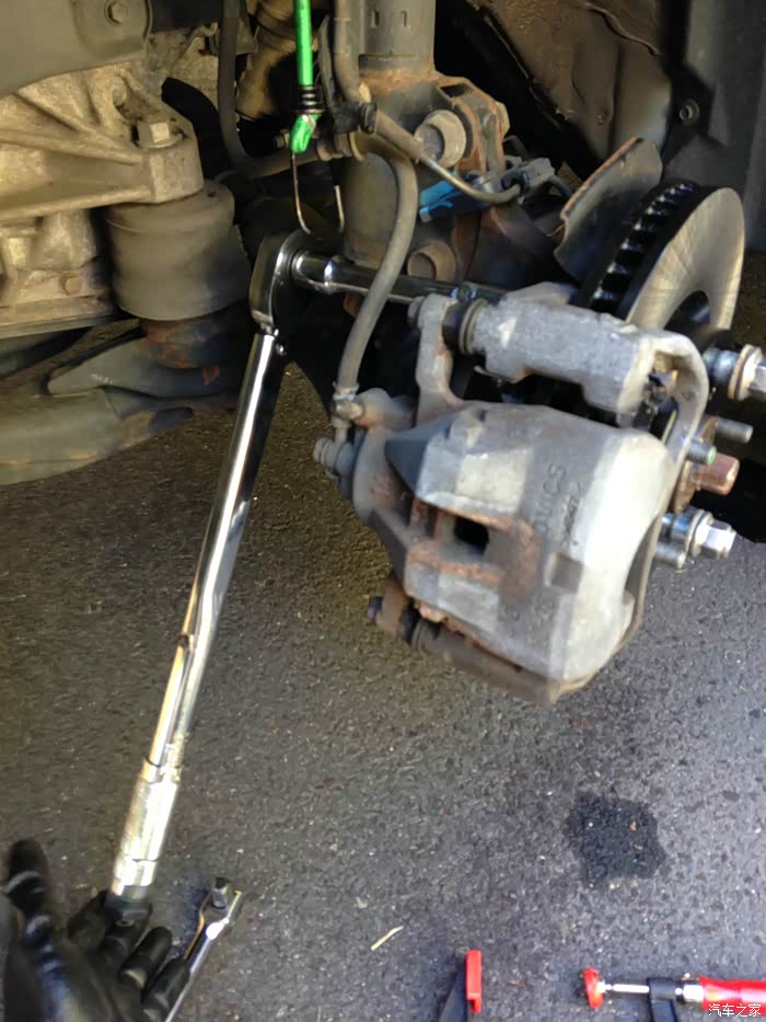 换刹车盘片具体准备工作和所用工具,可以参见我之前的那几篇换刹车的帖子。我在这就简单文字叙述下,就不给工具单独发图啦。 要用到的工具和耗材:千斤顶(我们用了两个,两边一起顶),安全支架(与千斤顶并排放置,保障安全),三角楔块(堵后轮用),棘轮扳手,扭矩扳手,加力杆,套筒,卡钳活塞复位工具, 钩绳(用来挂卡钳),钳子,锤子,WD40,卡钳润滑剂,防粘接剂,铜刷,厨房纸,垃圾袋,手套,护目镜。