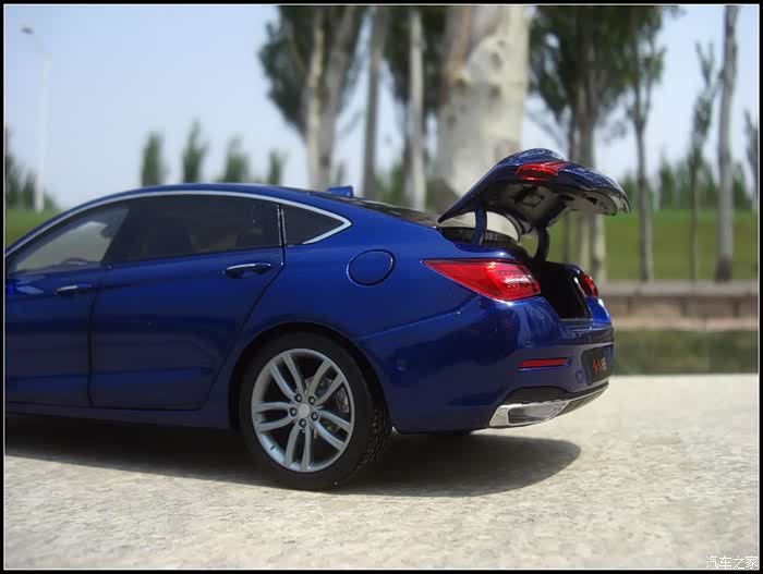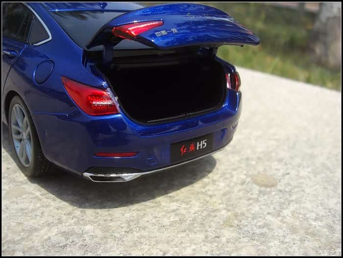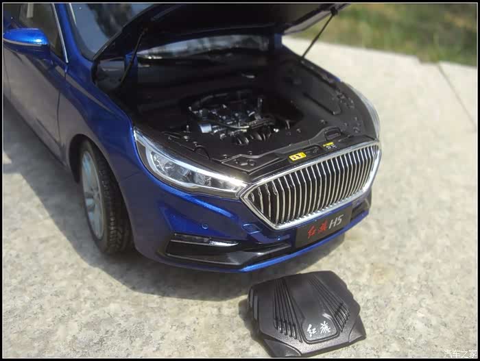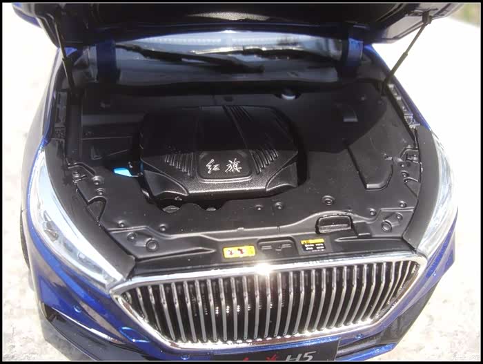 再说说这部模型做工吧,个人觉得相比于这三四百元的价格真的是非常良心啦!漆面光滑靓丽整体功能也很齐全前后盖四个车门以及天窗油箱盖都可开启,很多细节做的也很棒比如模型镂空的镀铬中网以及四个刻画非常精细的轮毂对了还有发动机装饰盖板居然可以独立拆卸。当然我也是仅针对我收藏这部蓝色的,据一些收了白色H5的朋友说漆面有色差缝隙大小不均等,所以个人在此建议如果想要收藏H5模型尽量还是不要选择白色的。